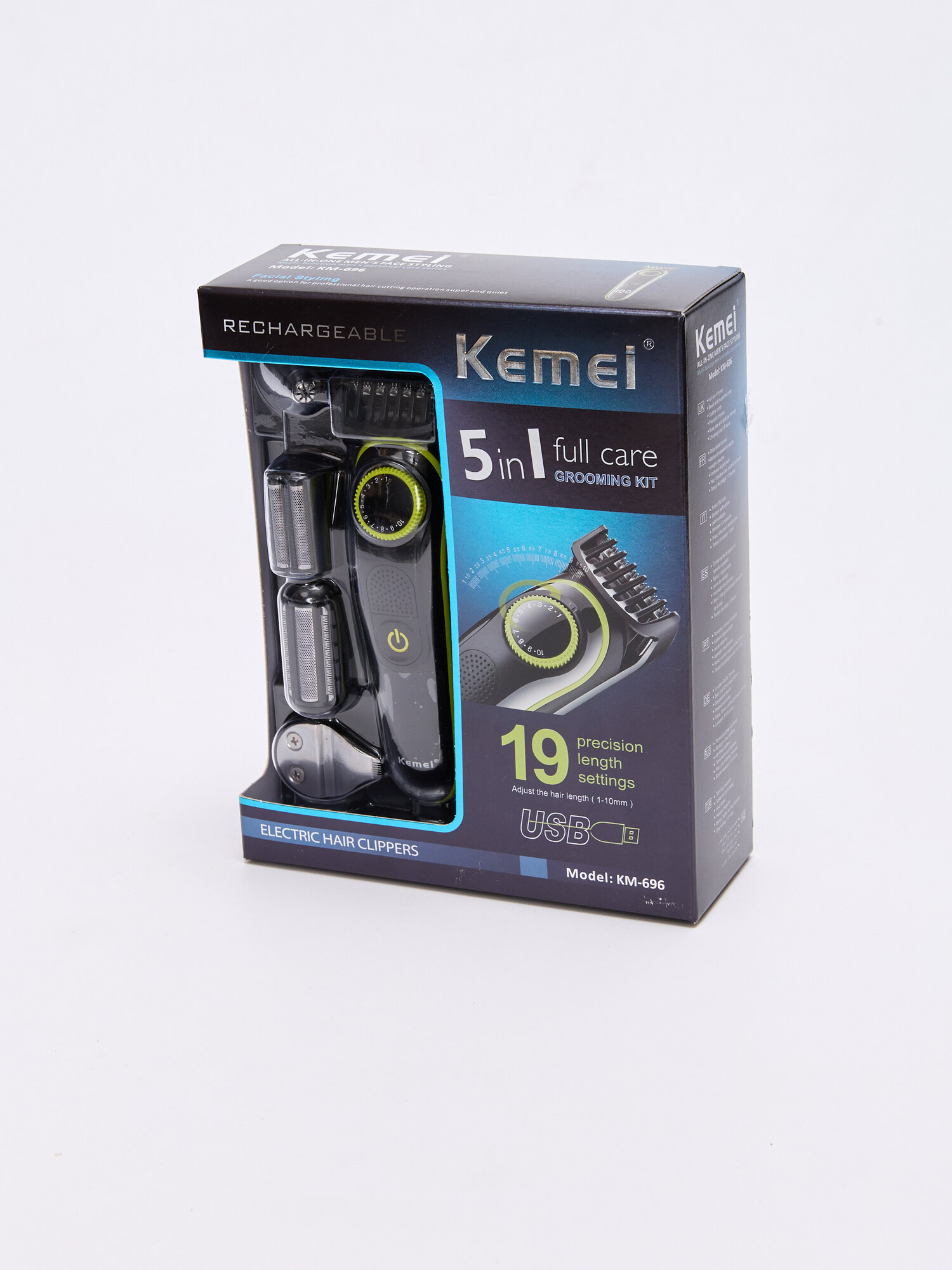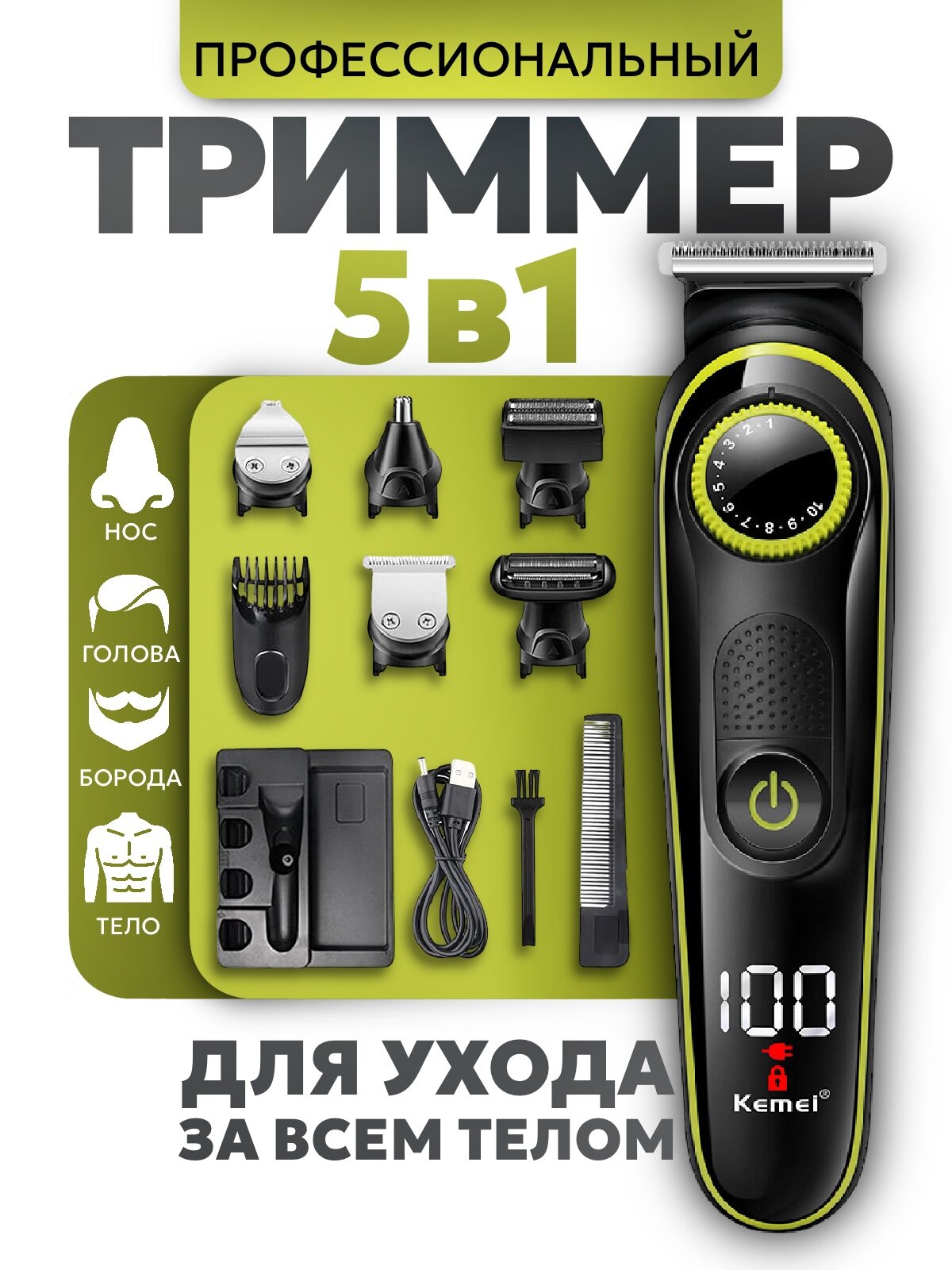 Триммер для стрижки бороды, волос, носа, ушей мужской Kemei KM-696, 6 насадок, черный интересное:
