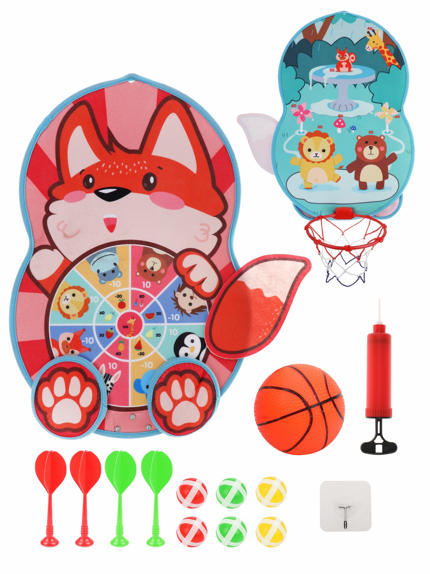 Игра комнатная ТМ "Moby Kids" Лисичка: Дартс с липучкой двусторонний 21 см. 2 в 1 с баскетбольным кольцом. 4 дротика и 6 шариков, мяч, насос в компл.