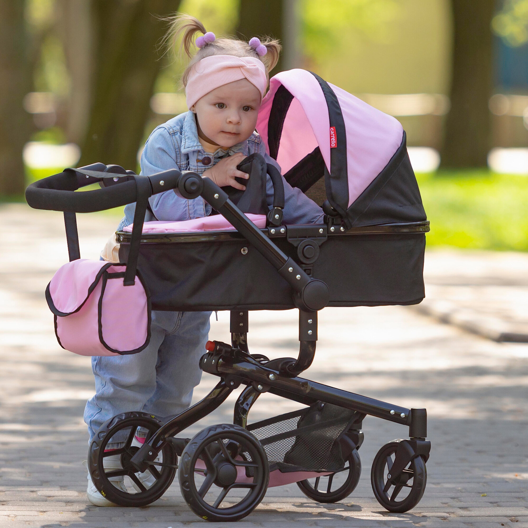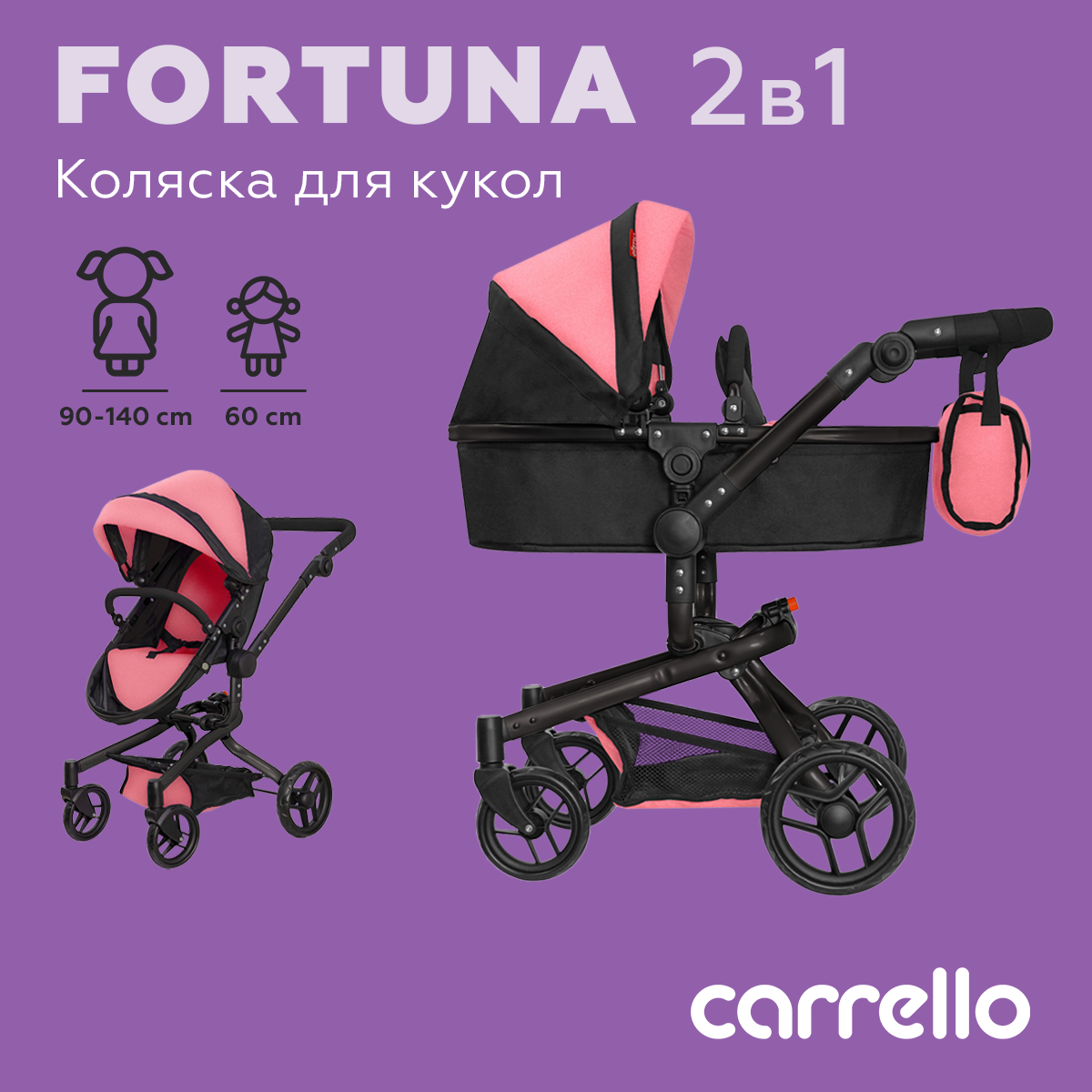 Коляска-трансформер для кукол Carrello Fortuna, складной капюшон, поворотные колеса, розовая с черной рамой