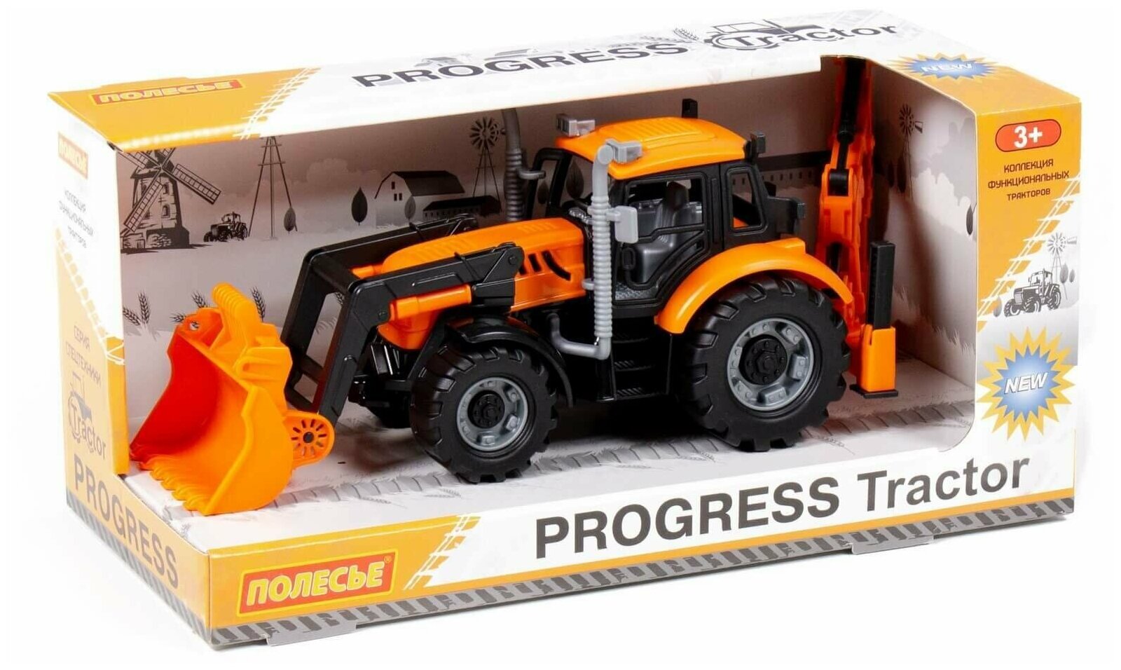 Инерционный трактор экскаватор-погрузчик Прогресс (оранжевый) 26 см Полесье интересное: