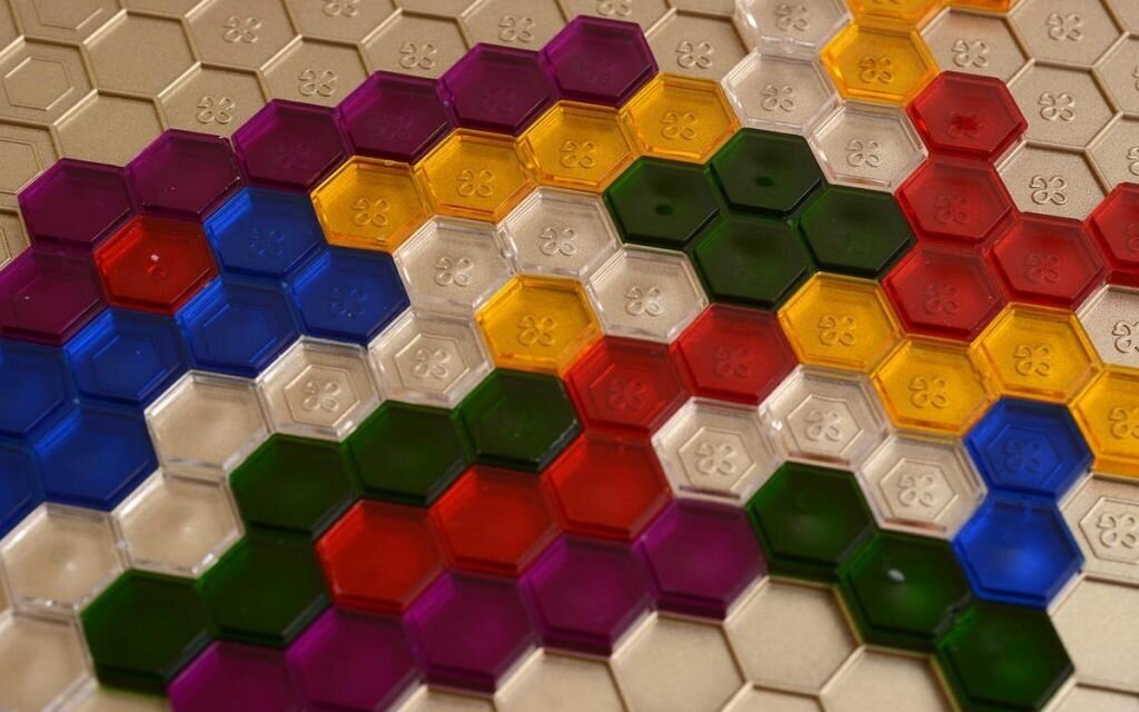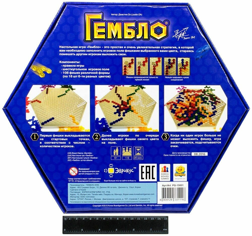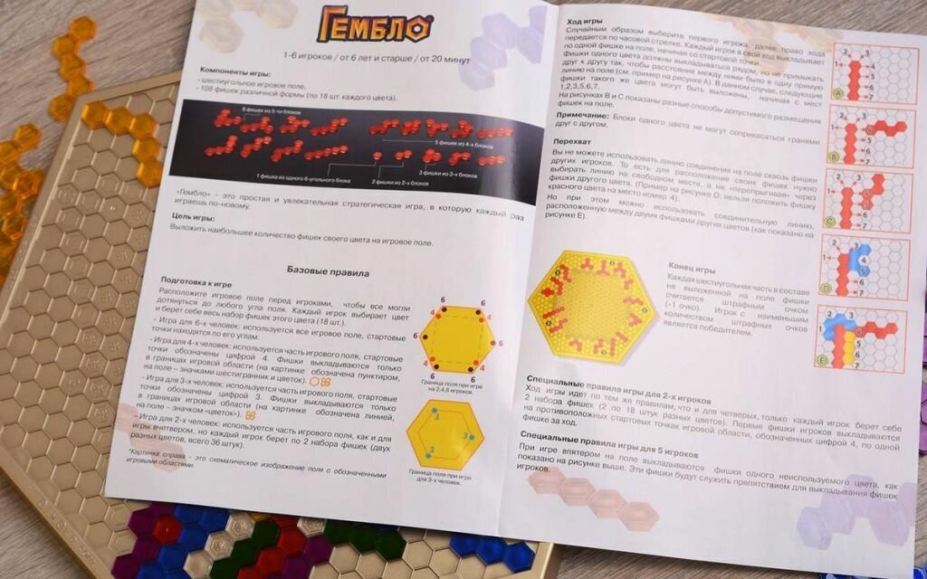 | Комплектация | 6-ти угольное игровое поле, 108 фишек различной формы (по 18 шт 6-ти разных цветов), правила игры |