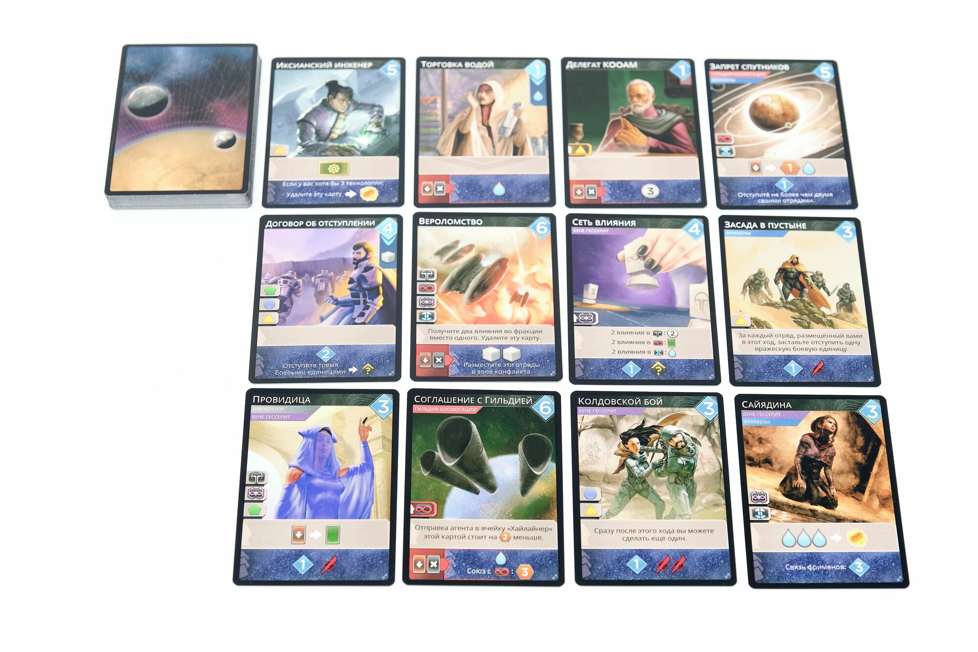 | Комплектация | игровое поле, справочник ячеек на игровом поле, 15 фишек воды, 24 фишки соляриев, 23 фишки пряности, фишка ментата, 18 карт конфликта, 24 карты резерва, 40 карт интриг, 67 карт империи, 8 планшетов лидеров, жетон первого игрока, 4 жетона союзов, 4 жетона барона харконнена, 31 карта дома хагаль, правила игры с домом хагаль |