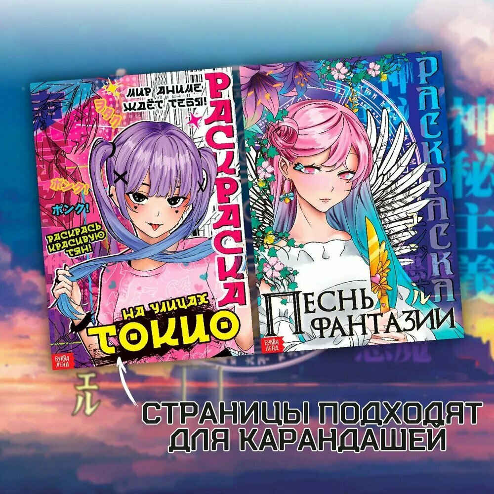| Комплектация | Раскраска аниме «На улицах Токио», 16 стр. Раскраска аниме «Песнь фантазии», 16 стр. |