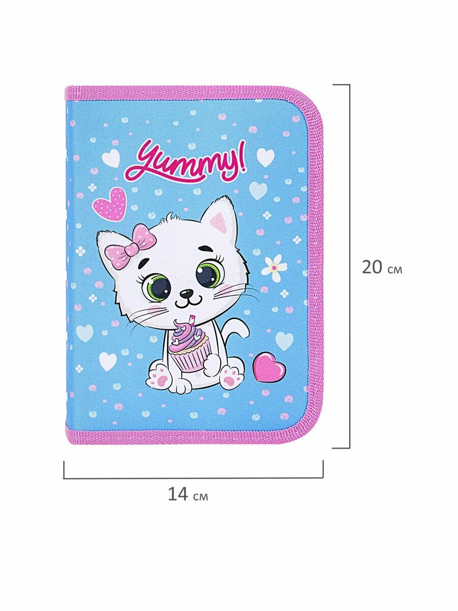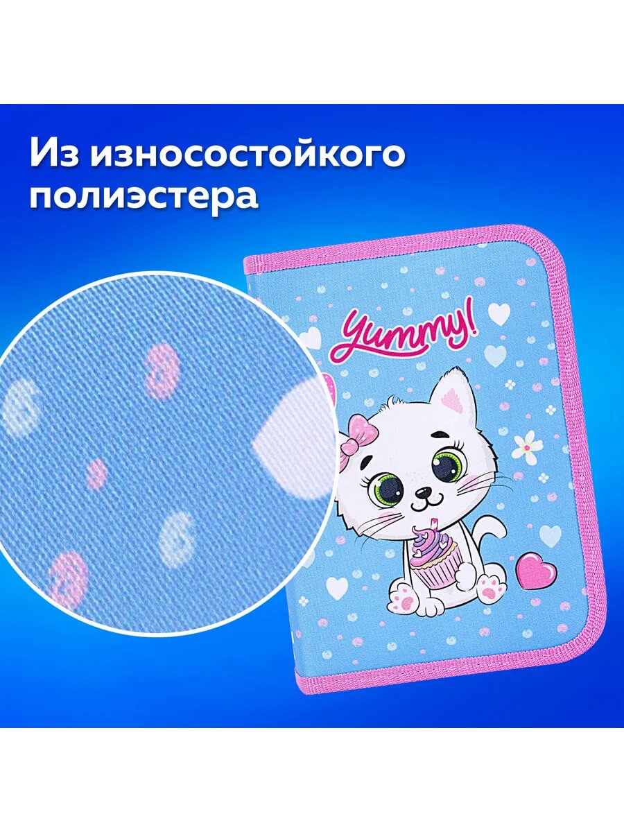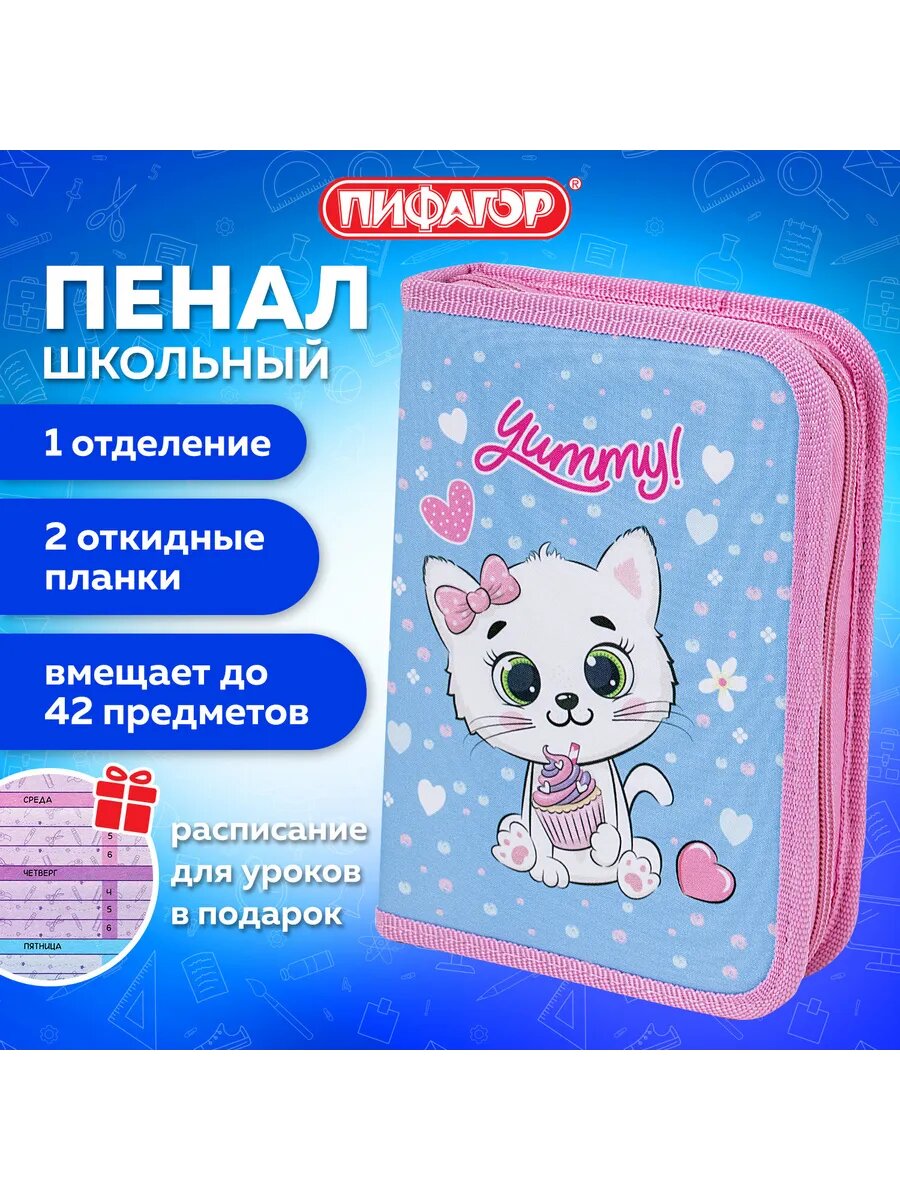 Пенал школьный для девочек для карандашей и ручек с 1 отделением, канцелярия для школы, 2 откидные планки, полиэстер, 20х14, Пифагор Cat, 272287