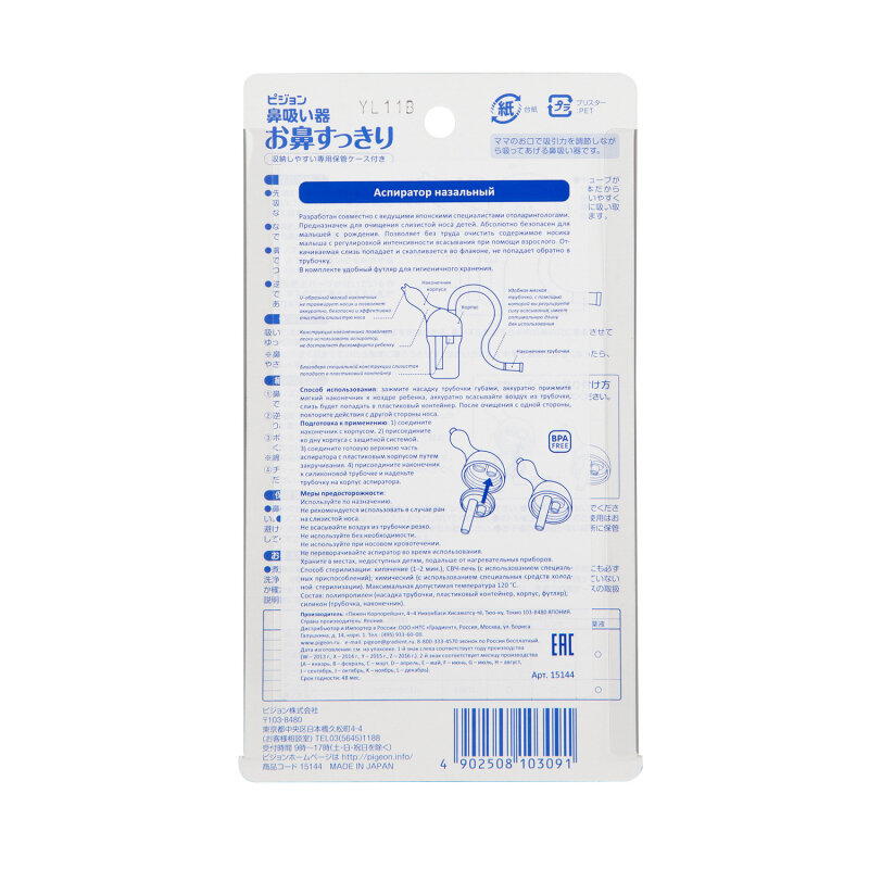 PIGEON Аспиратор BABY назальный с отводной трубочкой для удаления выделений из носа возраст 0+
