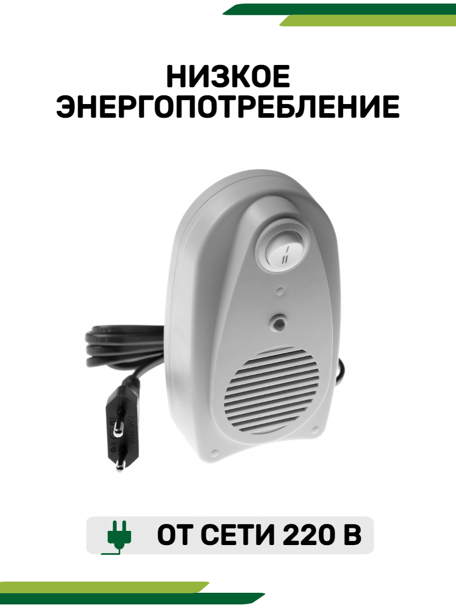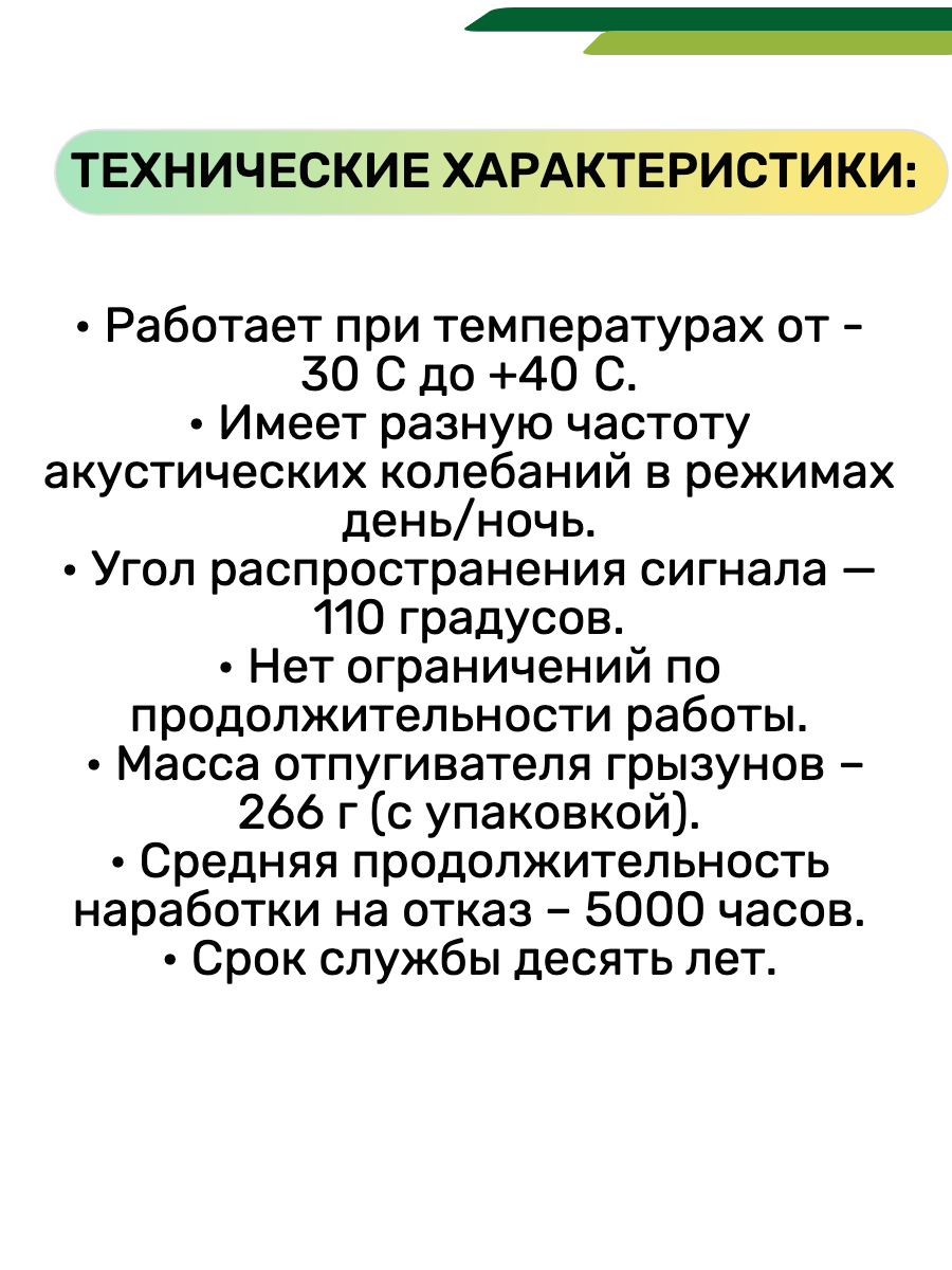 | Дополнительная информация | работает при температурах от – 10ْС до + 40ْС, имеет разную частоту акустических колебаний в режимах день/ночь o ([17-20];[50-100])кГц в дневном (зеленом) режиме; o ([5-8];[30-40])кГц в ночном (красном), угол распространения сигнала — 110 градусов, нет ограничений по продолжительности работы, средняя продолжительность наработки на отказ – 5000 часов |