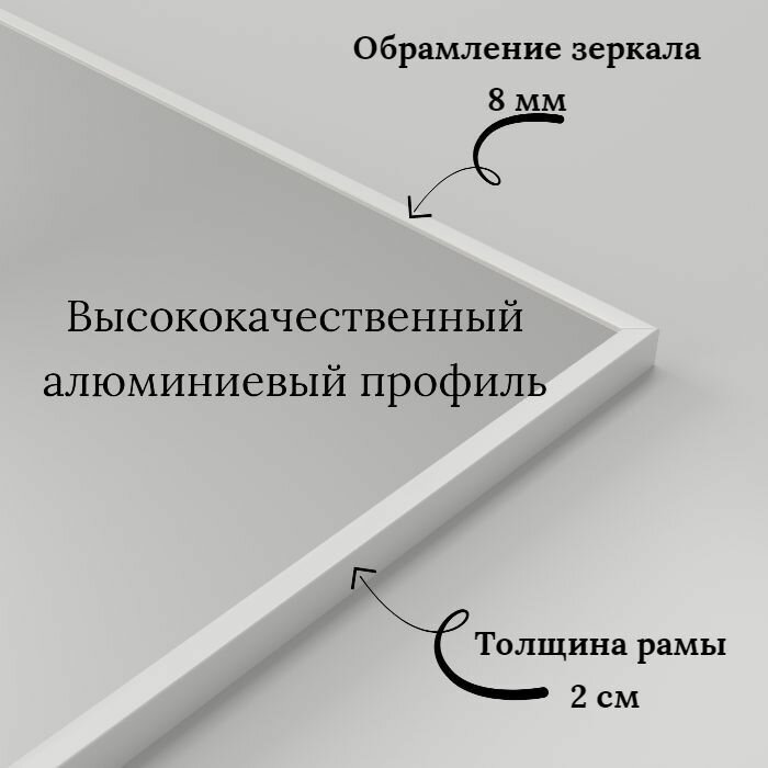 | Комплектация | 1. Зеркальное полотно в алюминиевой раме - 1 шт. (профиль: передняя ширина 8 мм, задняя ширина 45 мм, толщина профиля 20 мм) 2. Крепление подвесной системы - 2 шт. |