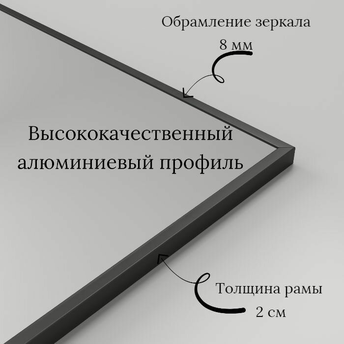 | Комплектация | 1. Зеркальное полотно в алюминиевой раме - 1 шт. (профиль: передняя ширина 8 мм, задняя ширина 45 мм, толщина профиля 20 мм) 2. Крепление подвесной системы - 2 шт. |
