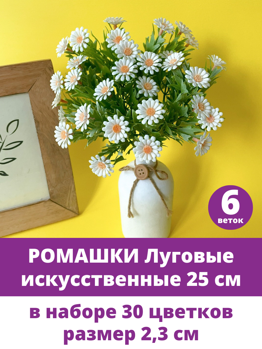 Купить Ромашки искусственные цветы, луговые, Белые, букет 25 см, цветок 2,3 см, в наборе 6 веток.