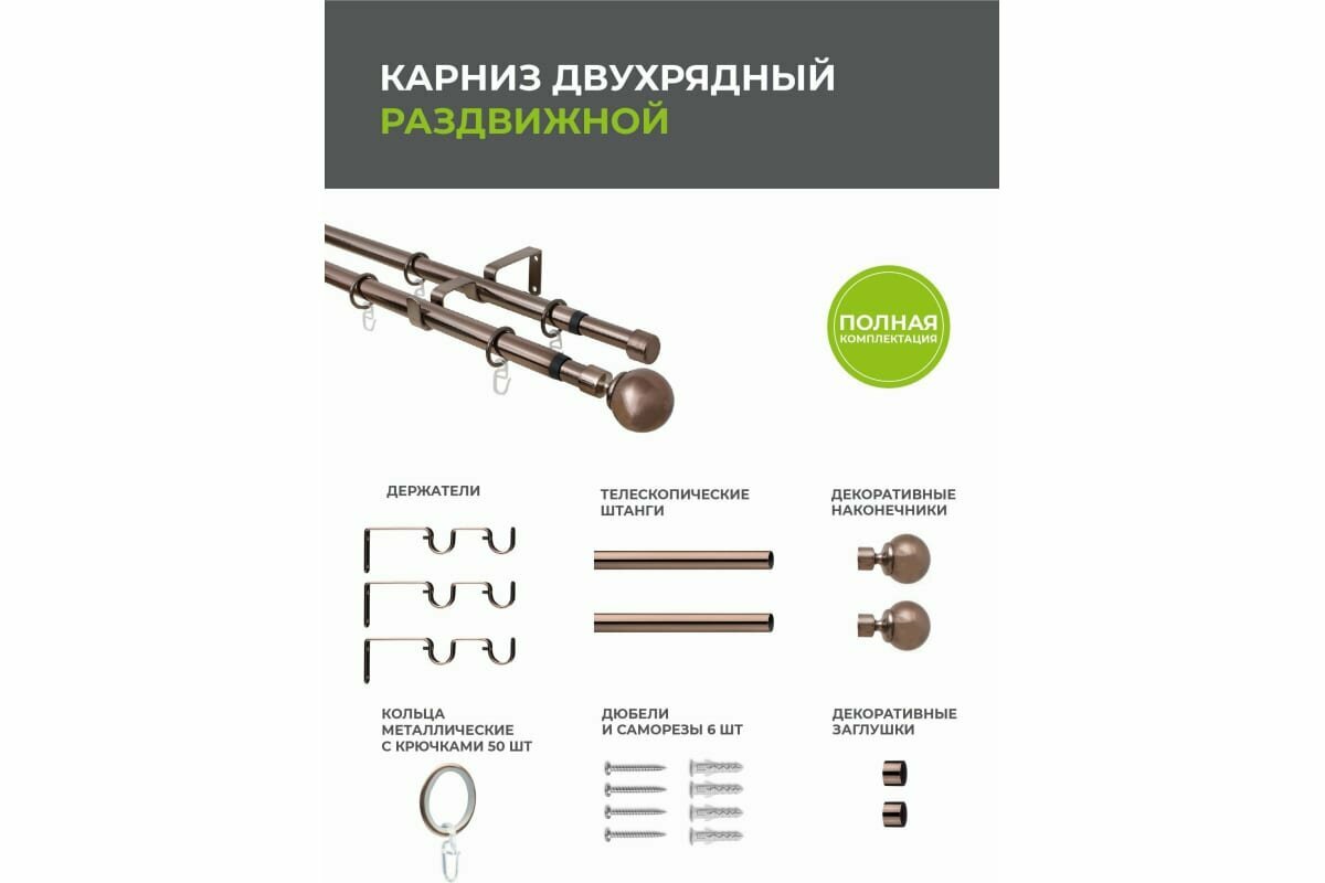 | Комплектация | Направляющая раздвижная - 2 шт, наконечники - 2 шт, заглушки - 2 шт, держатели - 3 шт, кольца с крючками - 50 шт, шурупы с дюбелями - 6 шт. |