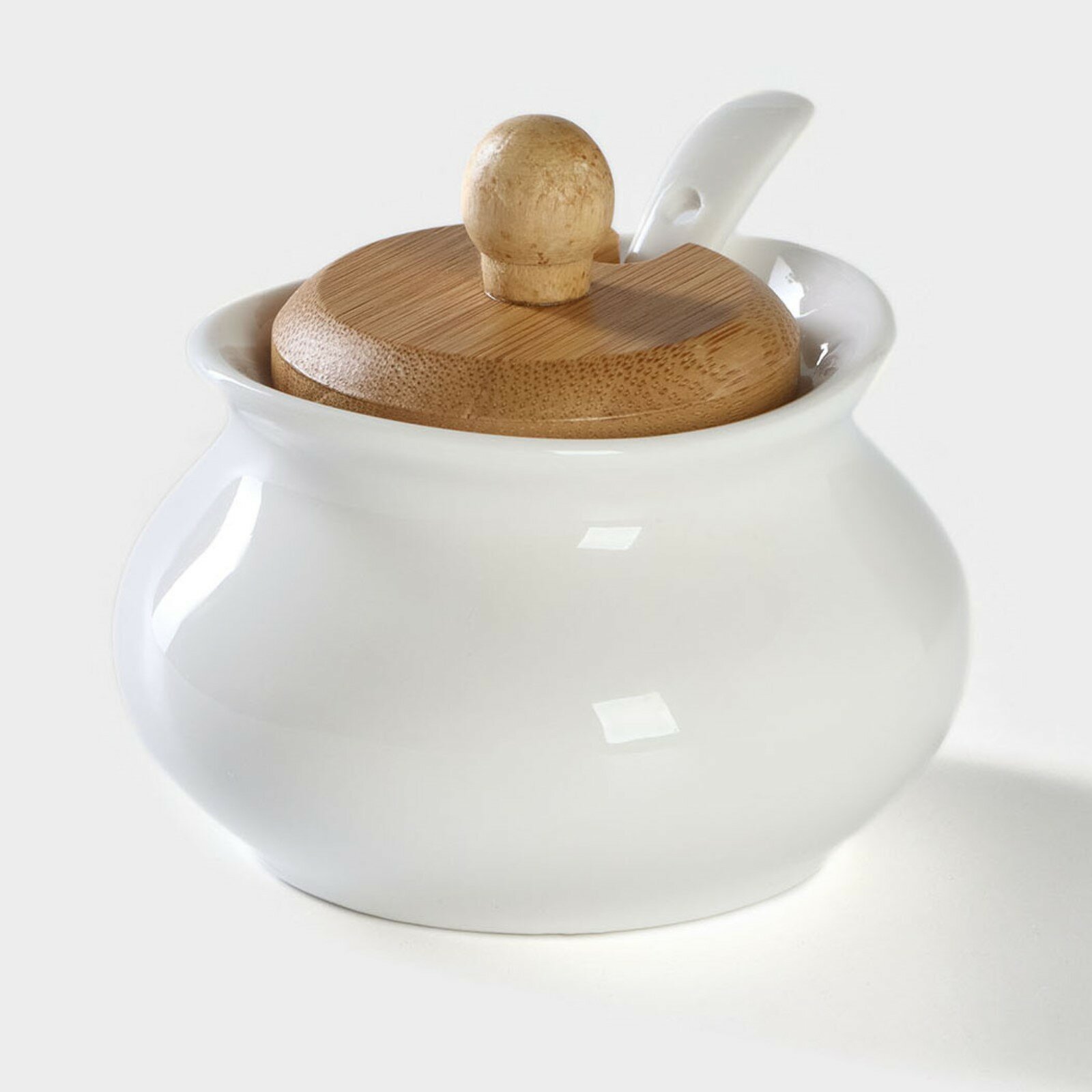 Купить Сахарница фарфоровая с крышкой и ложкой на деревянной подставке BellaTenero, 170 мл