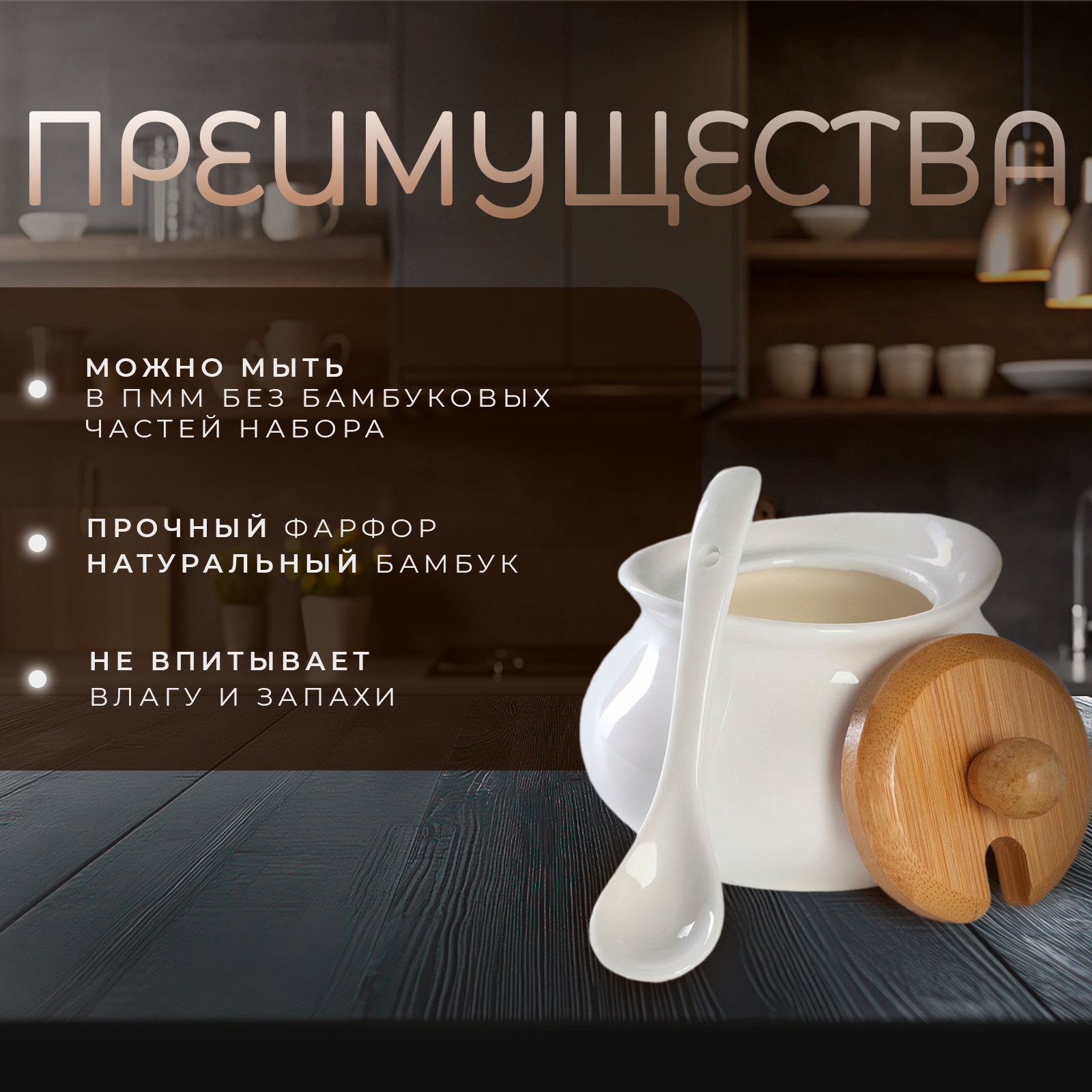 Сахарница фарфоровая с крышкой и ложкой на деревянной подставке BellaTenero, 250 мл