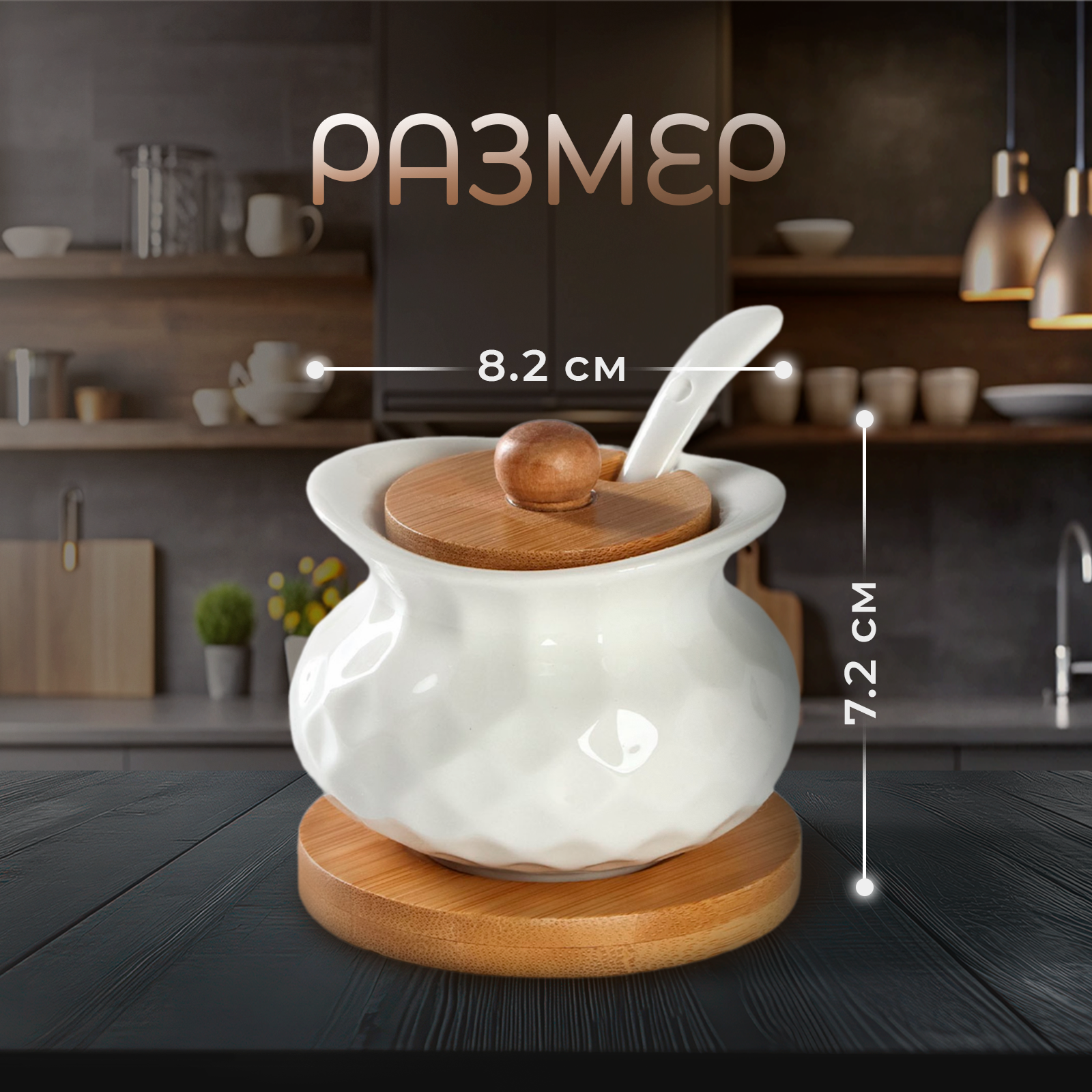 Сахарница фарфоровая с крышкой и ложкой на деревянной подставке BellaTenero, 250 мл