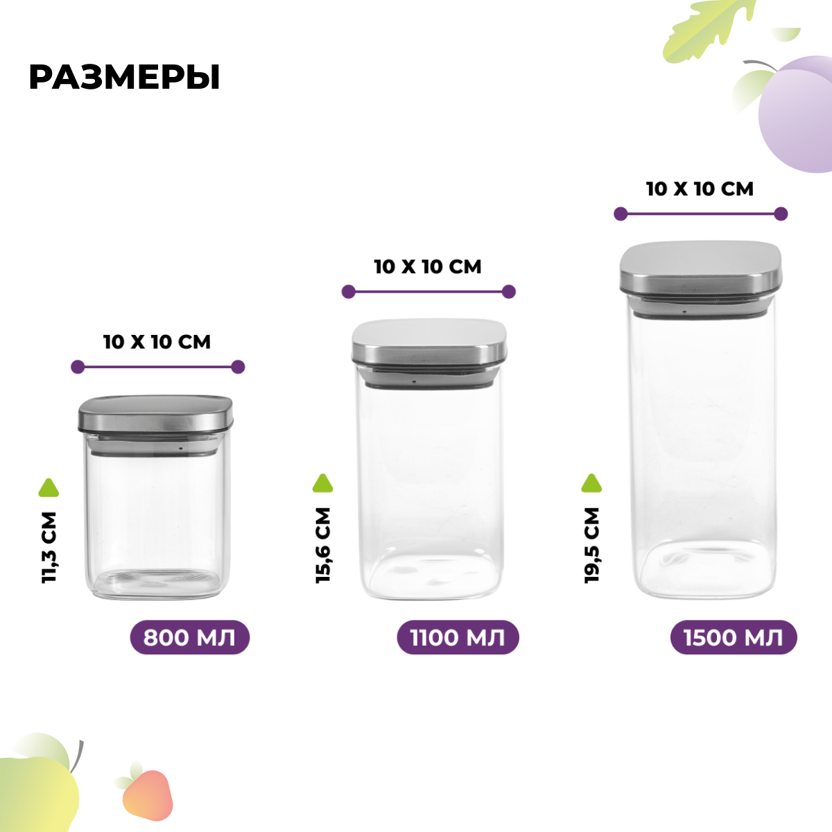 Купить Набор банок для хранения еды и сыпучих продуктов из жаропрочного стекла Eley 3 штуки - 800 мл,1100 мл,1500 мл