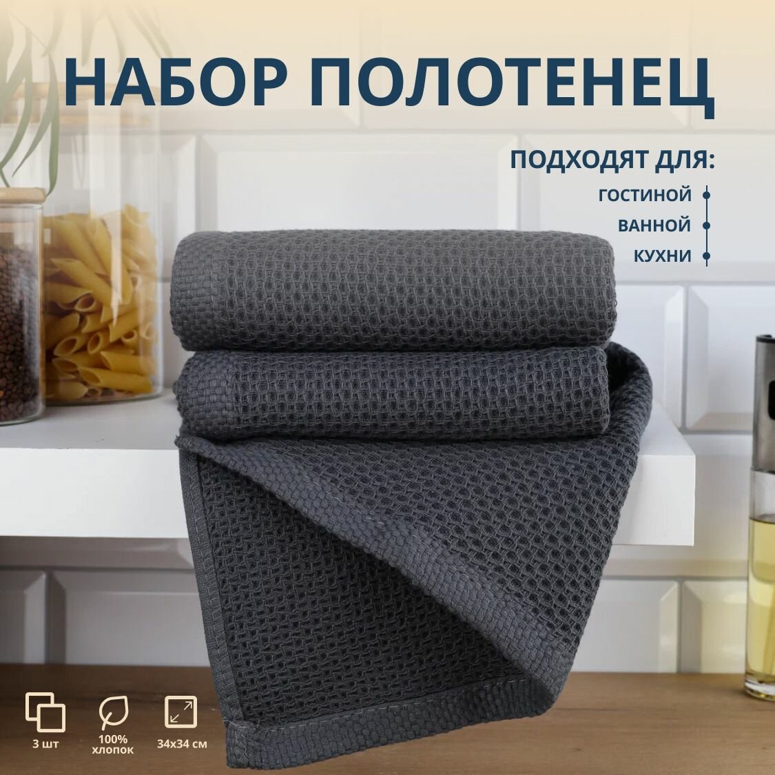 Кухонные полотенца 3 штуки, размер 34x34, состав хлопок, цвет графит, без рисунка интересное: