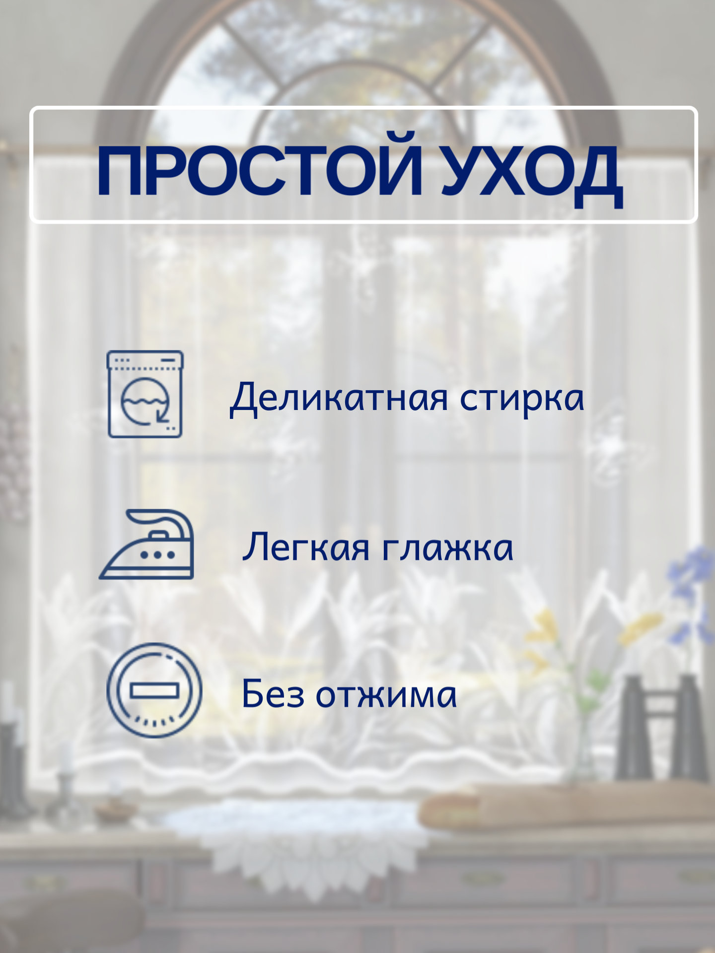 | Дополнительная информация | шторная лента приобретается отдельно; тонкая ткань требует бережного ухода. Поэтому придерживайтесь лёгких правил, и шторы сохранят первозданный внешний вид: стирайте изделие вручную или в машине при режиме деликатной стирки, отключив функцию отжима; на пару часов замочите изделие в тёплой воде (при 30 — 40 °C) с добавлением моющего средства; поместите штору в стиральную машину, выберите режим деликатной стирки при температуре не выше 30 °C; по окончанию стирки, не отжимая, слегка встряхните изделие и повесьте на окна; утюжить штору следует через марлю, пока она влажная, и при невысокой температуре утюга. Совет от опытных домохозяек: для наименьшей сминаемости перед загрузкой стиральной машины поместите штору в наволочку или специальную сетку; тщательно полоскайте шторы, чтобы остатки моющего средства не повлияли на цвет изделия |