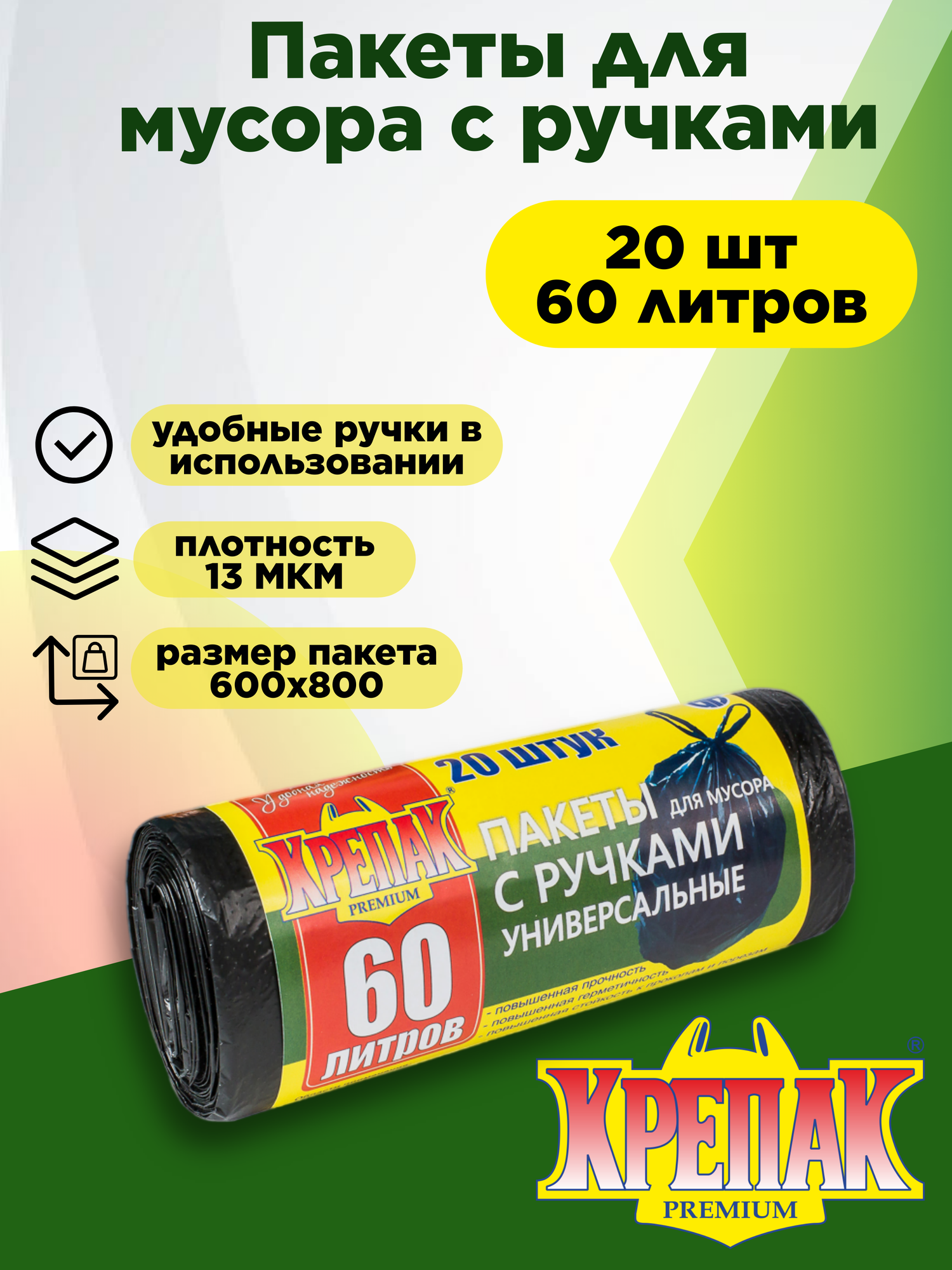 Мешки для мусора «Крепак», 60 л, с ручками, ПНД, 13 мкм, 60×80 см, 20 шт