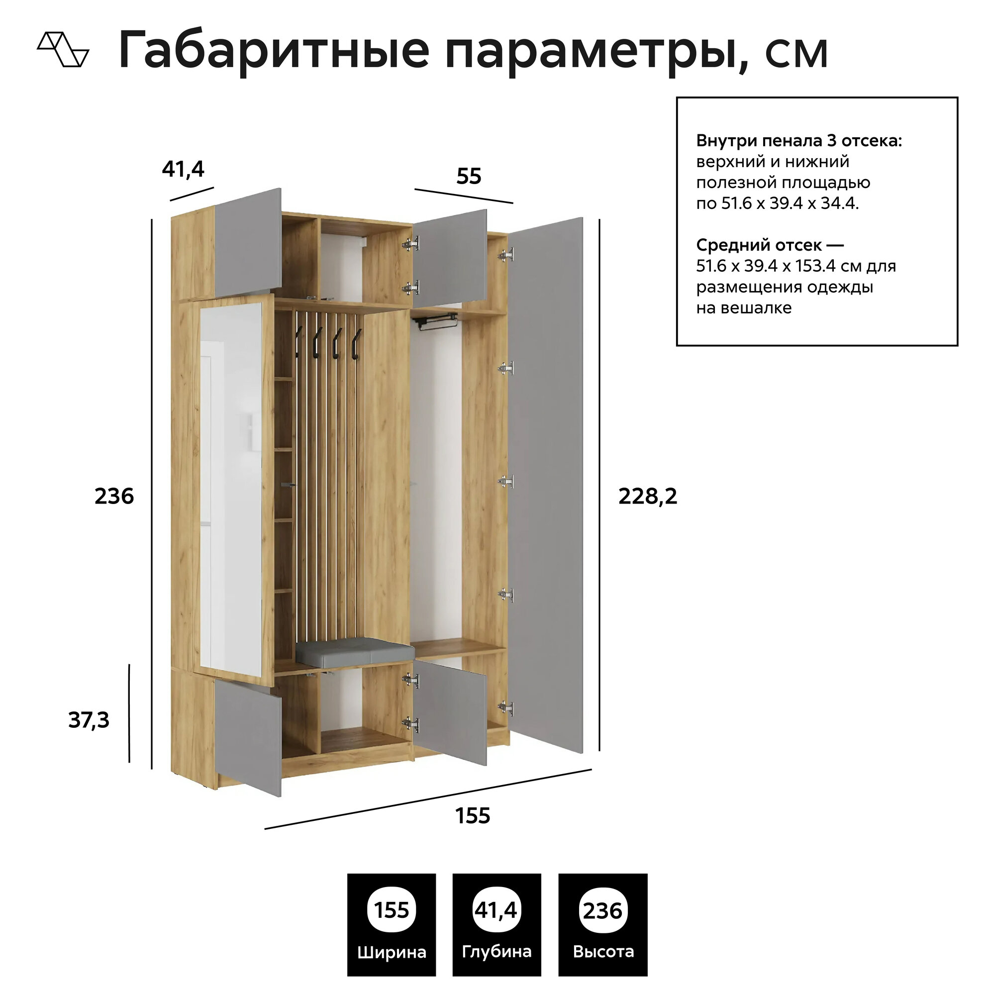 СохранитьПрихожая с зеркалом Нонтон Бостон №3 дуб крафт золотой / серый шифер, 155х41.4х236 см интересное: