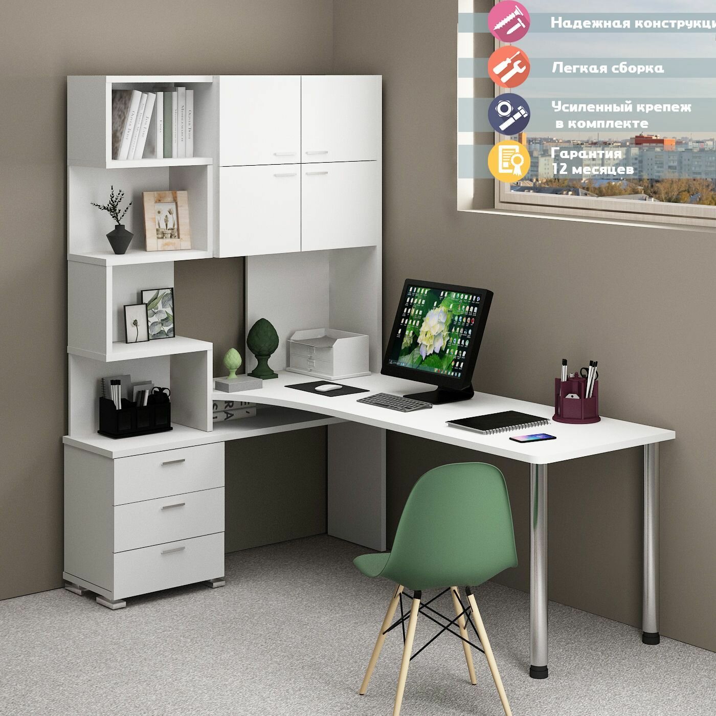 Стол компьютерный Мэрдэс СР-500М/160 БЕ-ПРАВ Белый, с надстройкой, угловой, 130х160х199 см
