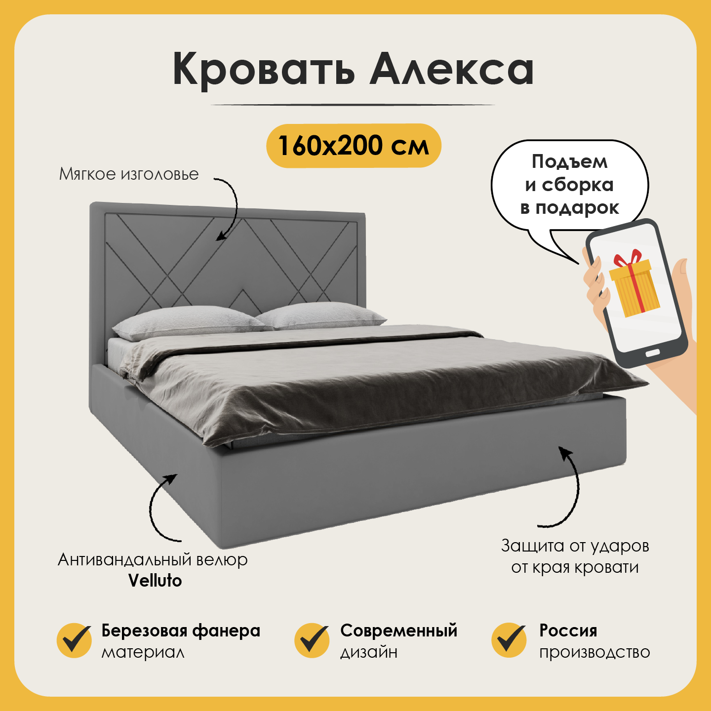 | Особенности | мягкое изголовье, с изножьем, с подъемным механизмом |