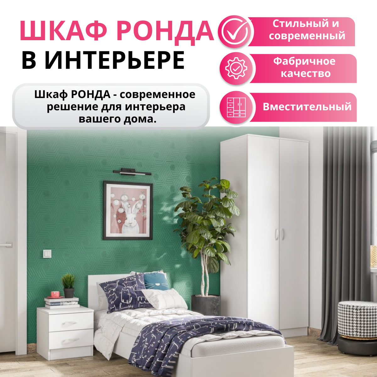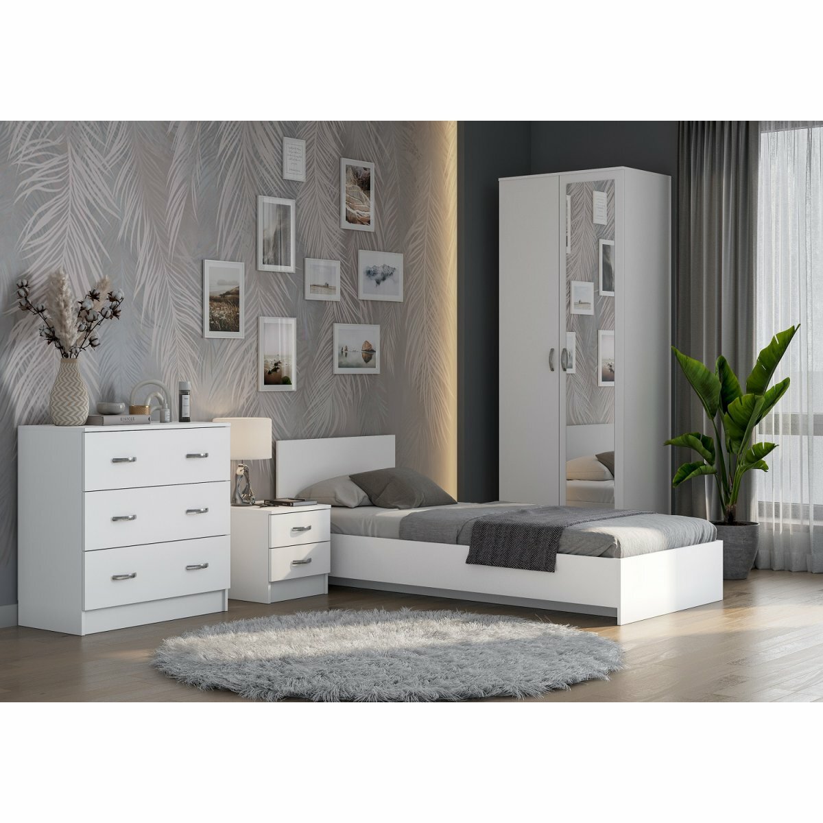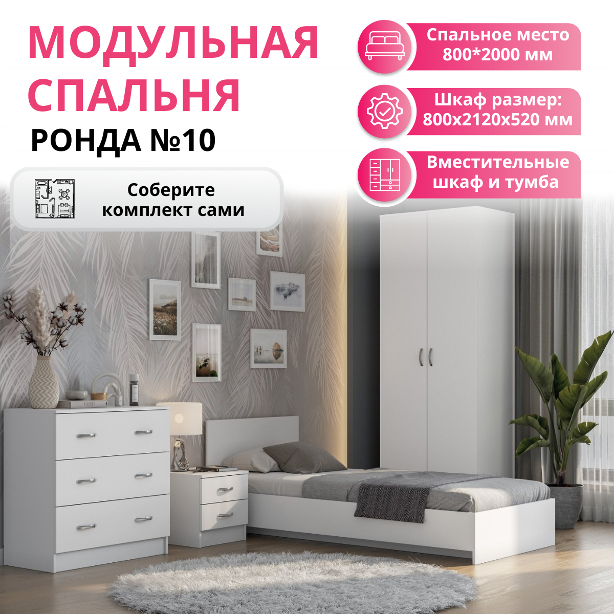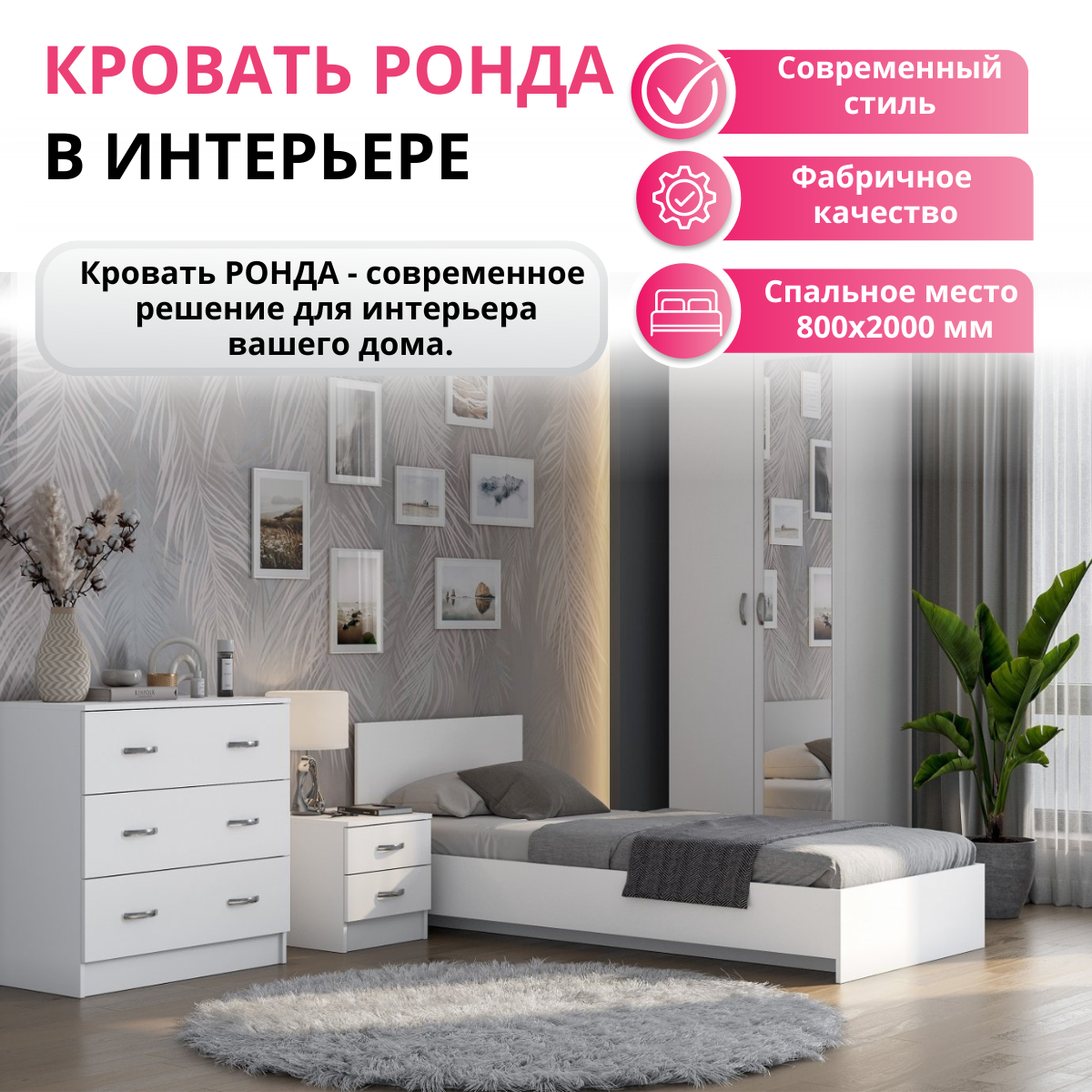 1 шт мс для спальни Ронда КР-080 (без основания) белое дерево/белое дерево + 1 шт мс для спальни Ронда основание КР-080 ЛДСП белый (Интерьер-Центр)