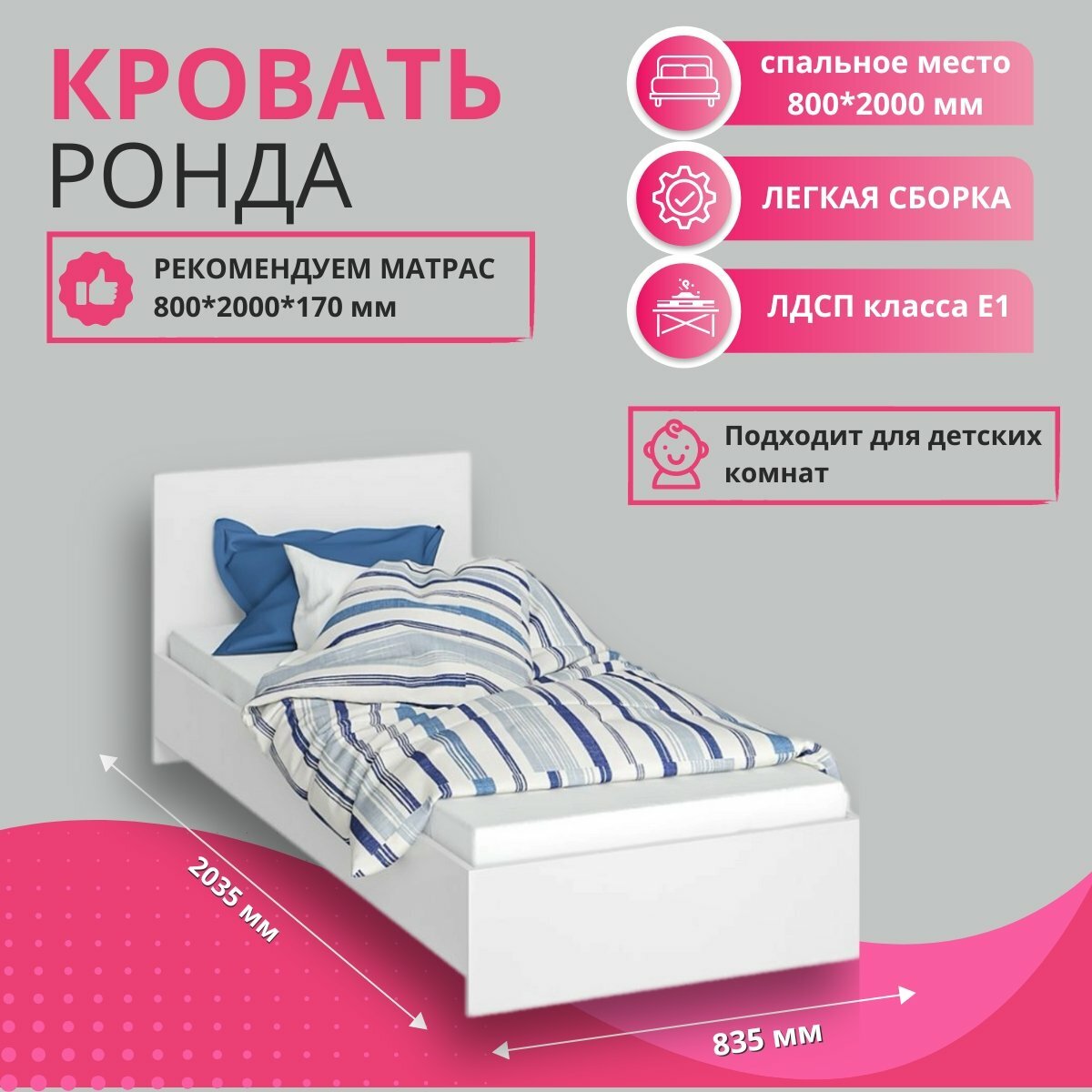 Кровать с основанием ДСП Ронда КР-080 80х200, белый