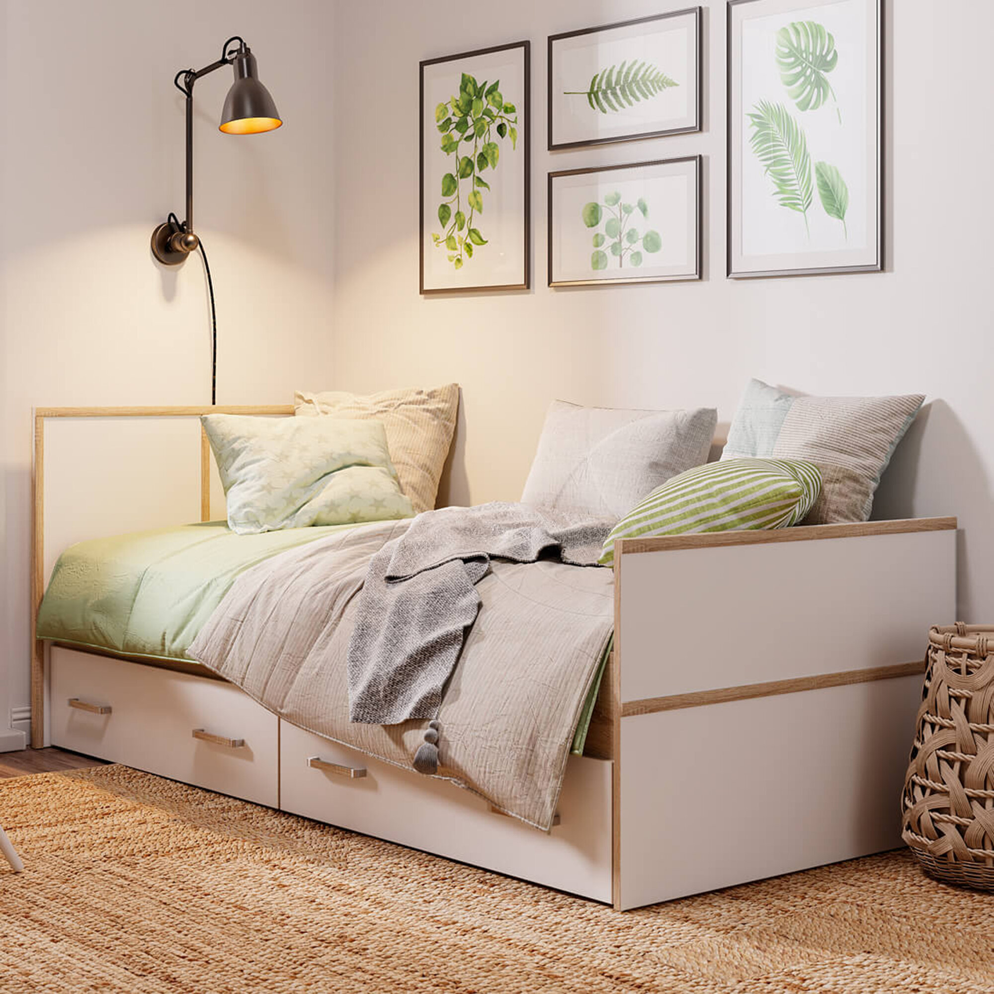 Кровать односпальная Сакура 90х200 см, с ящиками, основание настил, с изножьем, со спинкой, Дуб Сонома / Белый