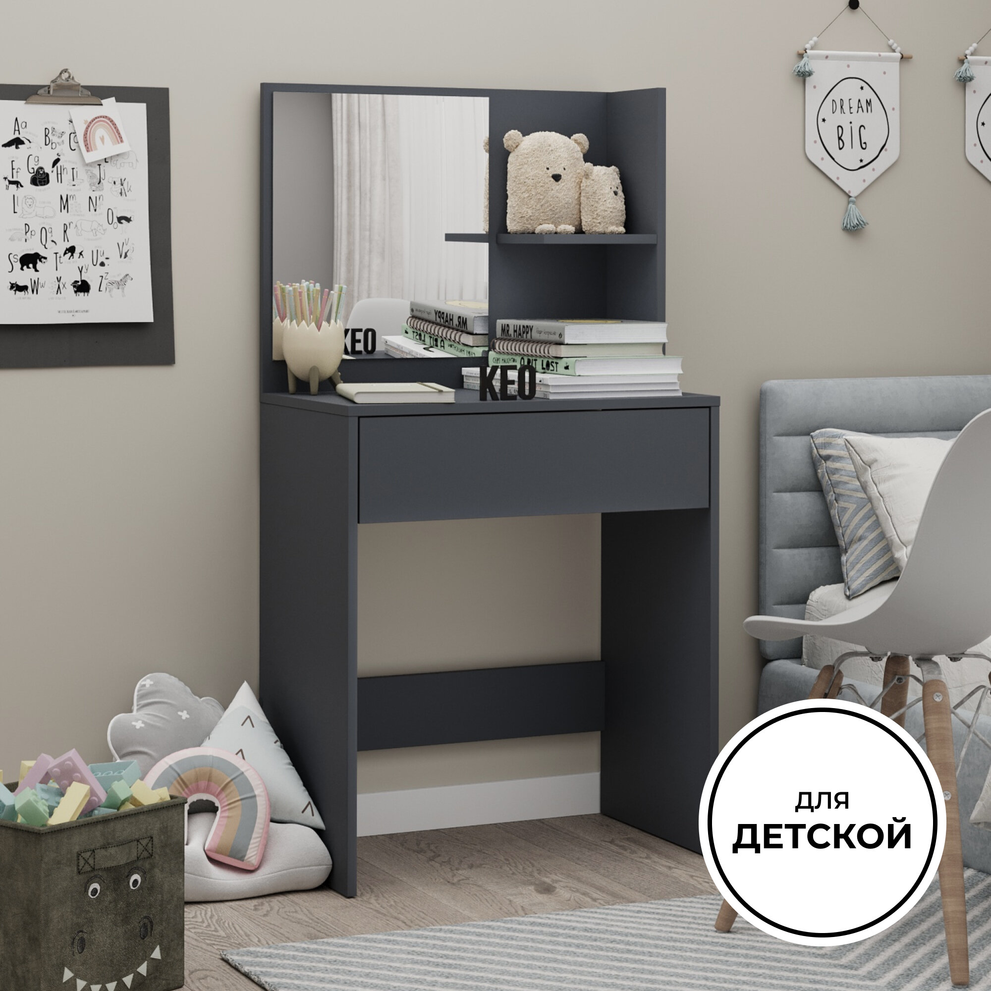 Туалетный столик с зеркалом с открытой полкой и выдвижным ящиком Кео СТЛ-110 графит