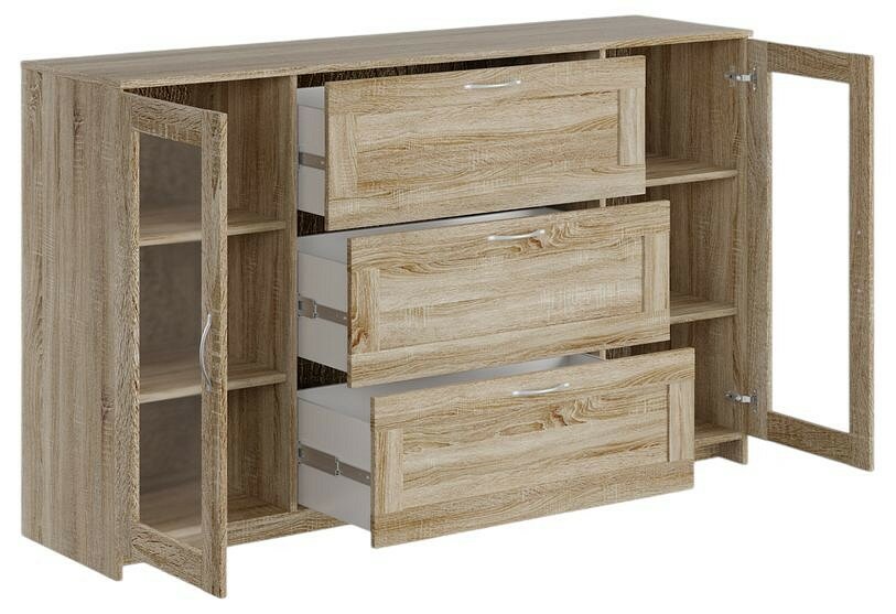 Тумба двухдверная, 156х95 см, с тремя выдвижными ящиками, двери со стеклом, сонома