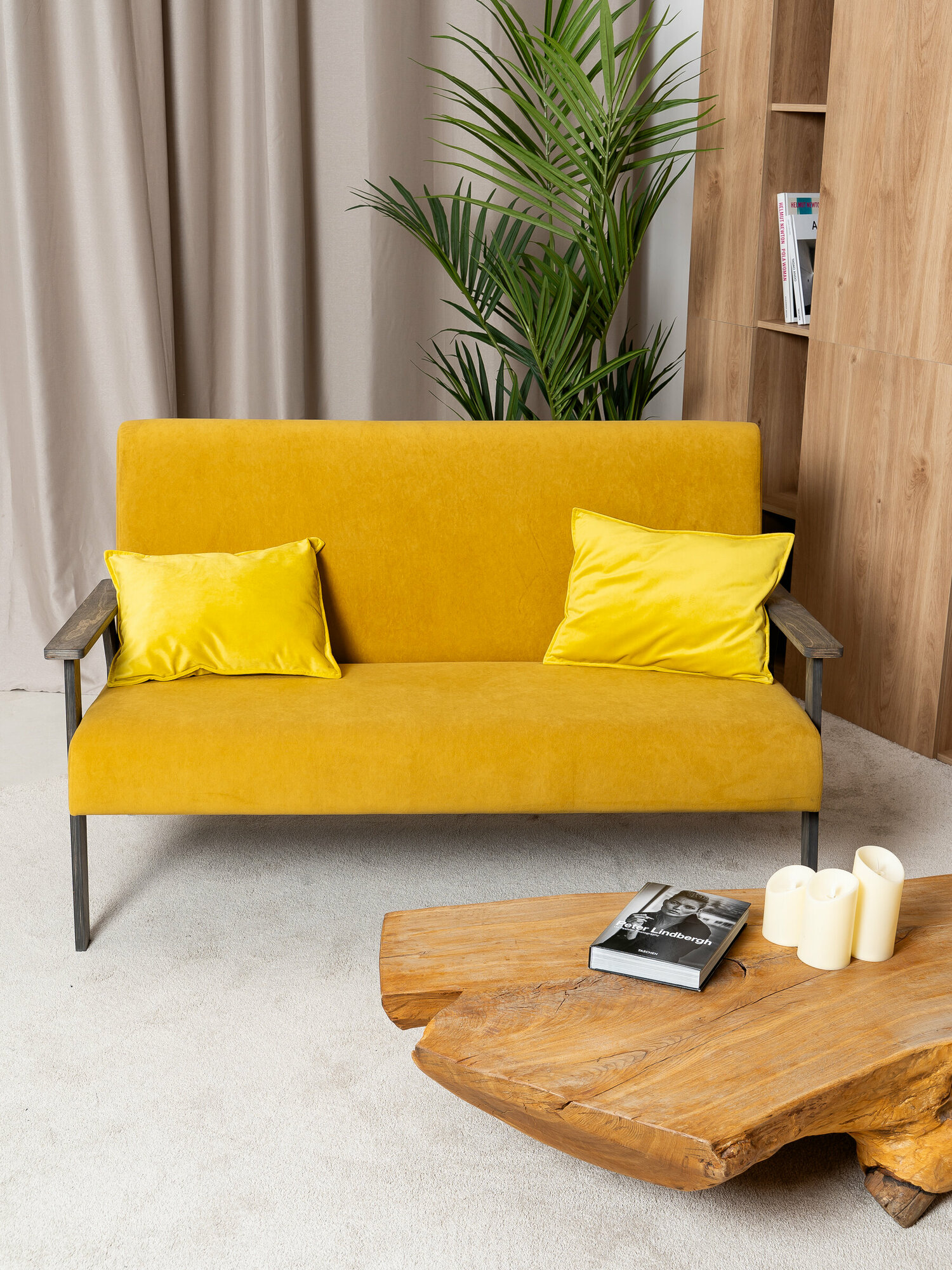Прямой диван Relax, горчичный,коричневое масло 2-х местный, 138x75x80