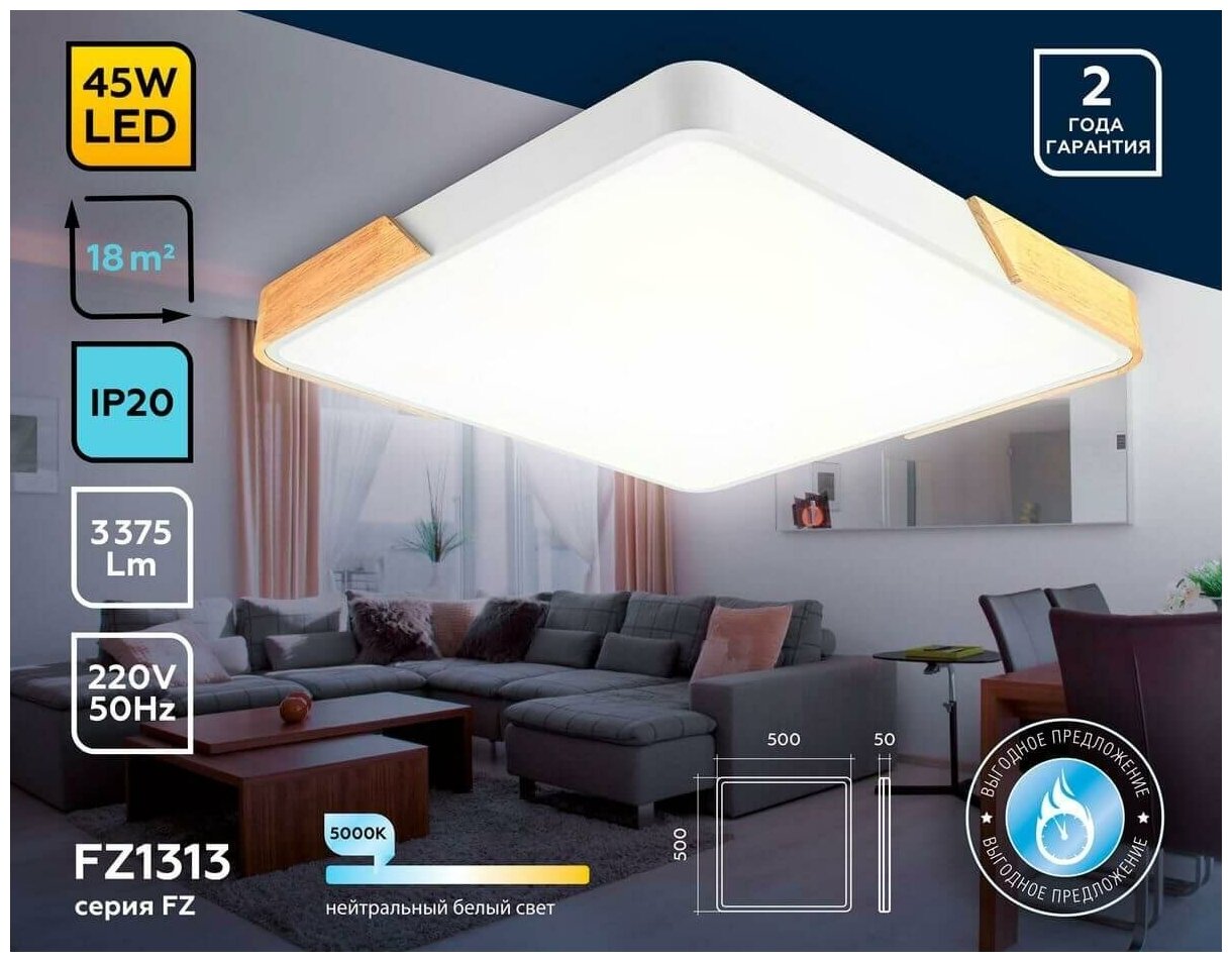 Потолочный светодиодный светильник FZ1312 WH/LW белый/светлое дерево 36W 5000K 400*400*50 (без ПДУ)