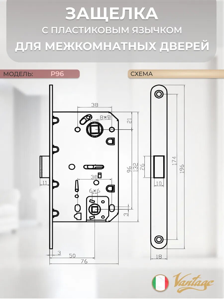 Дверная защелка, замок межкомнатный Vantage P 96 SB с пластиковой защелкой под фиксатор, матовое золото
