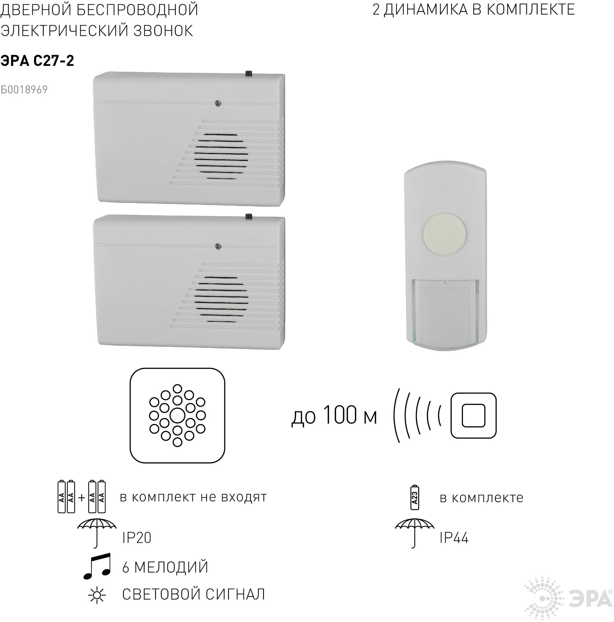 Дверной звонок беспроводной ЭРА C27-2 на батарейках уличный влагозащищенный 2 динамика, белый, 6 мелодий, 100 м
