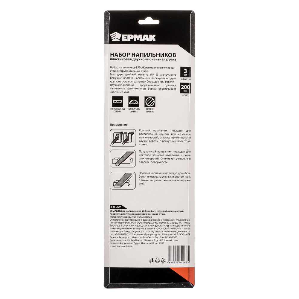 Набор напильников ермак, 200мм 3шт(круглый, полукруглый, плоский), для дерева, металла, пластика, пластиковая двухкомпонентная ручка