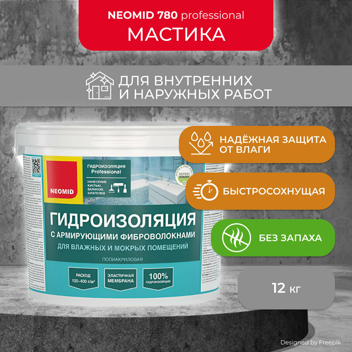 Купить Мастика гидроизоляционная Neomid 780, с армирующими фиброволокнами, 12 кг