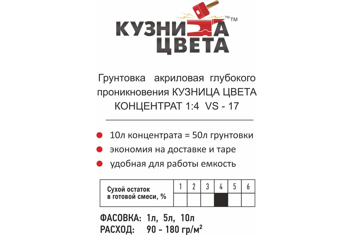 Кузница Цвета Акриловая грунтовка глубокого проникновения, концентрат 1:4 VS-17, для внешних и внутренних работ УТ00001052