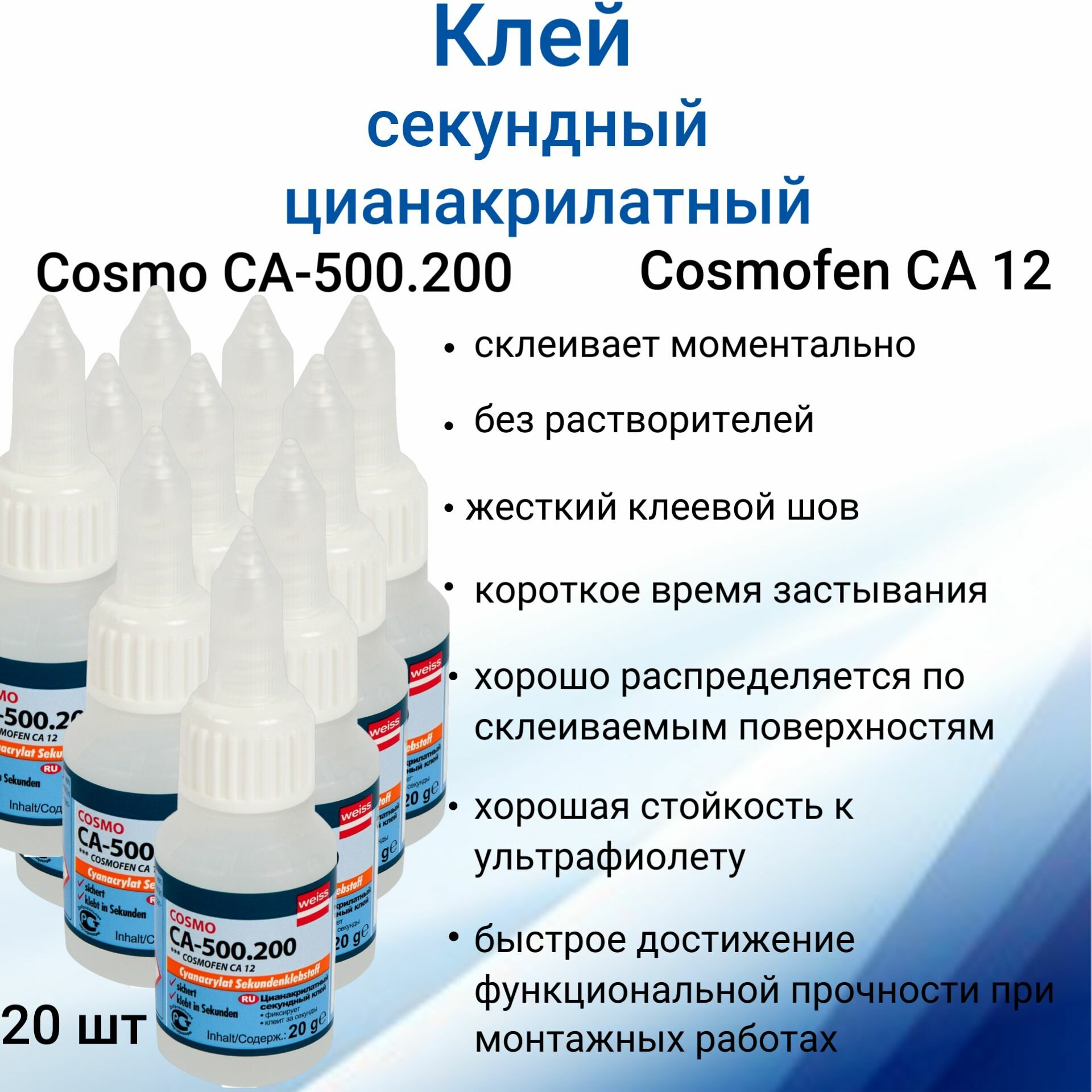 Комплект 50 штук, Клей цианоакрилатный секундный 20г COSMOCA-500.200(COSMOFEN CA 12)FL95/FL97