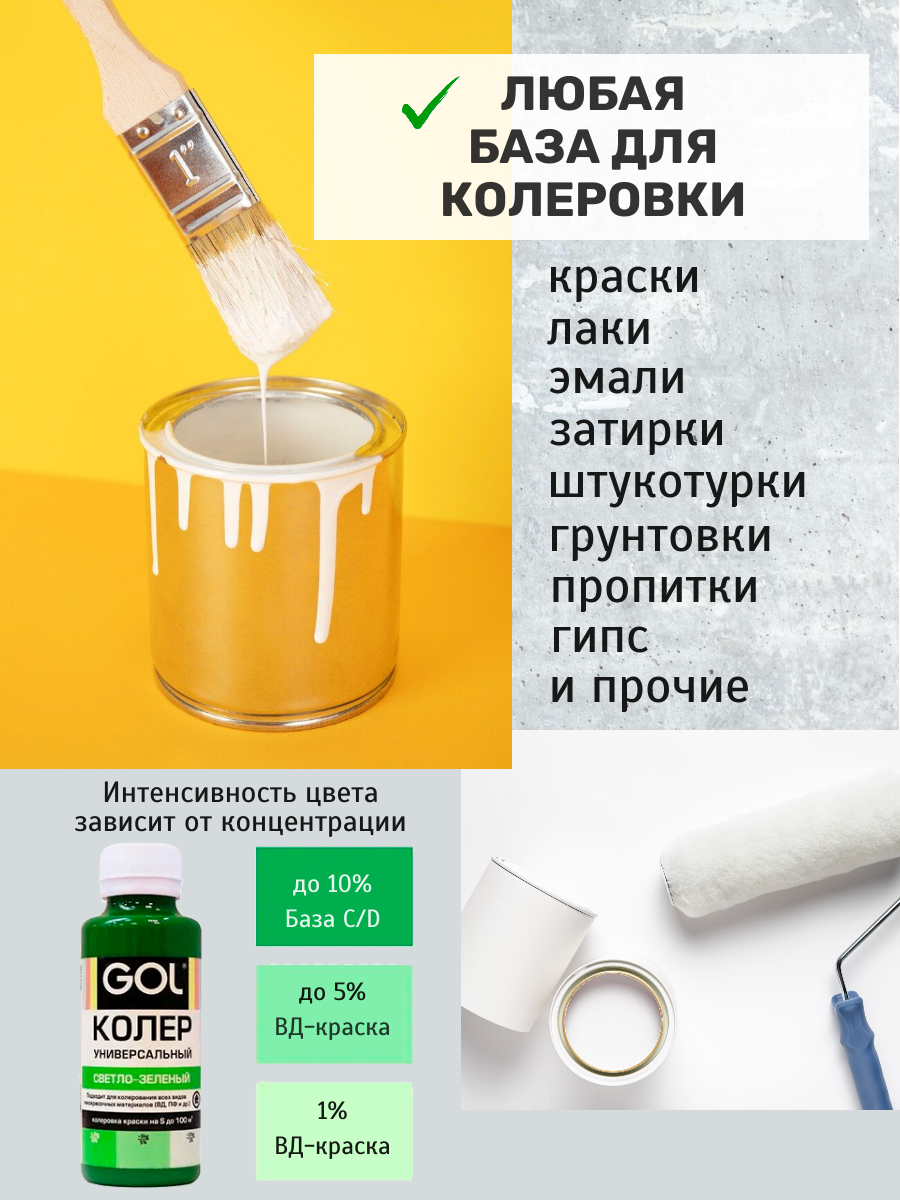 СохранитьНабор колер для краски светло-зеленый универсальный GOL для гипса, лака, эмали, штукатурки, затирки. 2 шт. интересное: