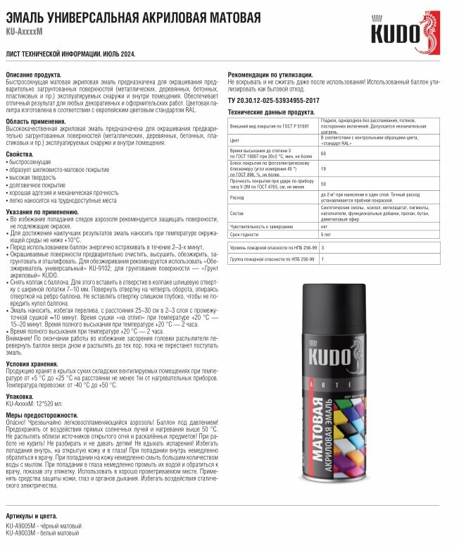СохранитьАэрозольная краска эмаль KUDO, 520 мл, RAL 9003, акриловая белая матовая, 12 шт интересное:
