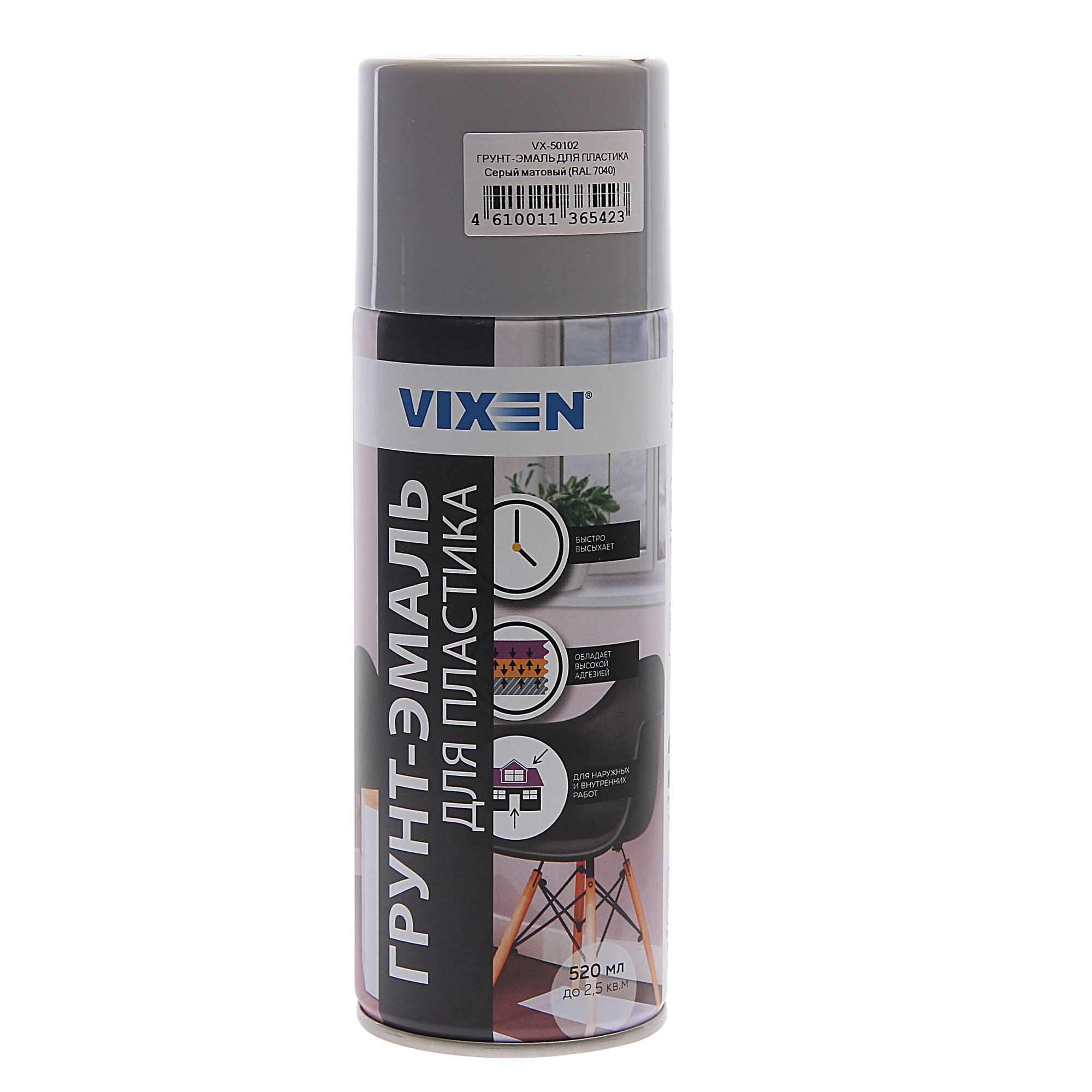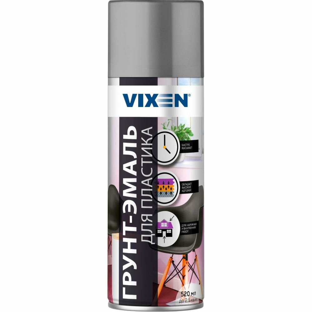 Грунт-эмаль для пластика, серый матовый, аэрозоль VX-50102 520мл, VX50102 VIXEN VX-50102