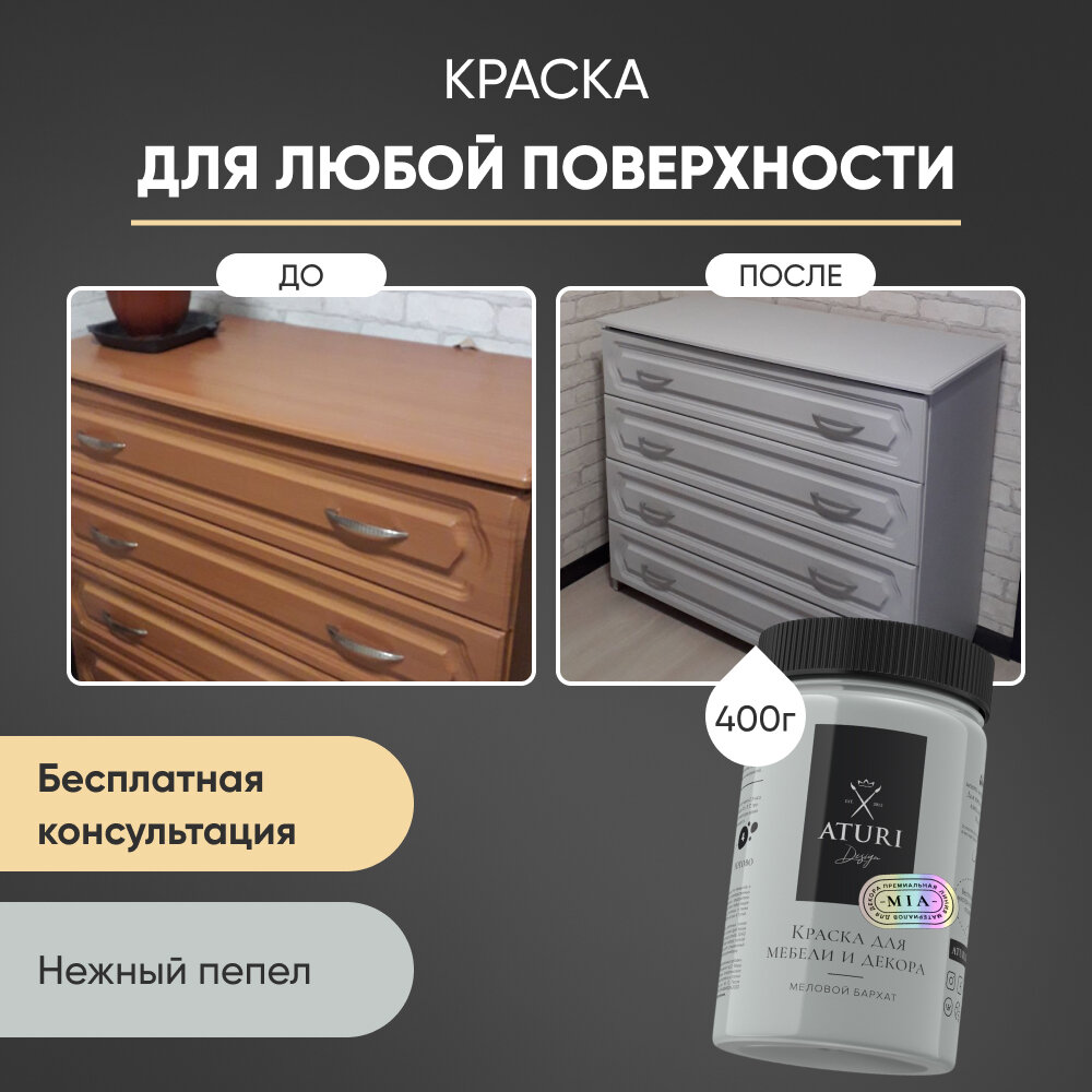 СохранитьМатовая краска для мебели Aturi Design Mia 0,4 кг. Цвет: Нежный пепел, светло-серый, без запаха, меловая, быстросохнущая интересное: