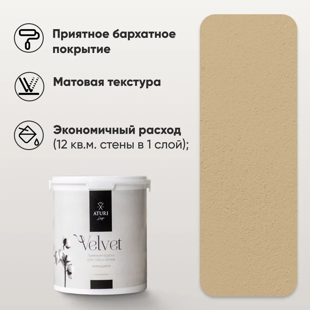 Краска для стен моющаяся Aturi Design для обоев интерьерная, для потолка, без запаха быстросохнущая, водоэмульсионная акриловая матовая; Цвет: Жемчужный бархат, бежевая 1,5 кг