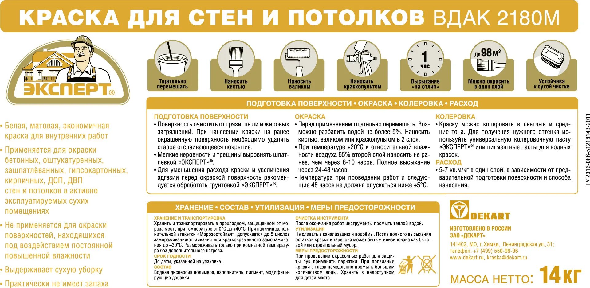 | Дополнительная информация | для окраски стен и потолков в активно эксплуатируемых сухих помещениях |