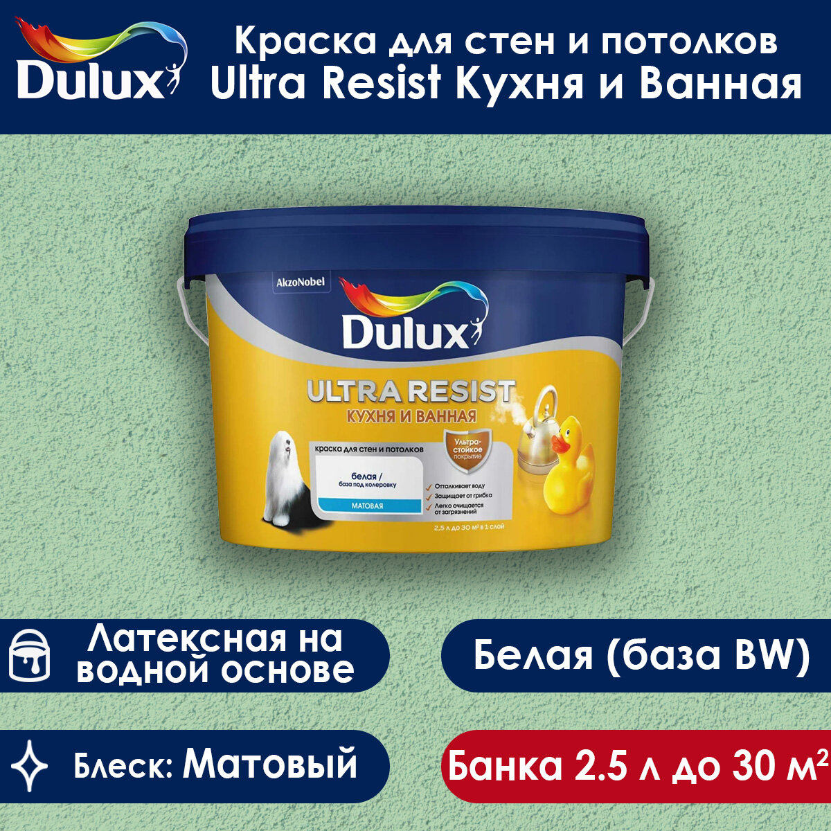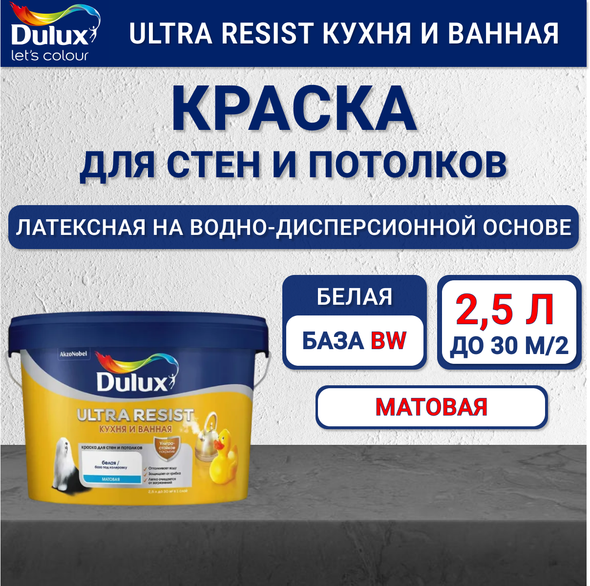 DULUX ULTRA RESIST кухня И ванная краска с защитой от плесени и грибка, матовая, база BW (2,5л)