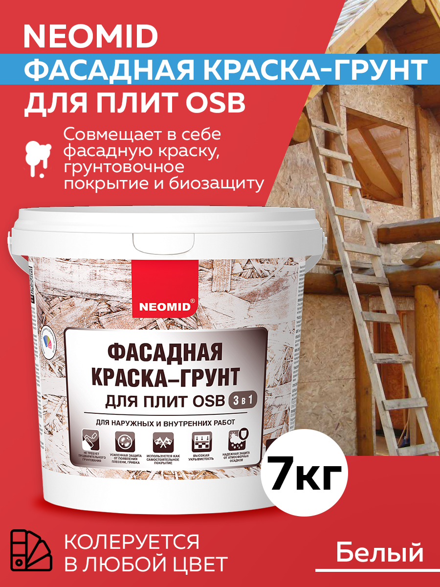 Купить Краска-Грунт Фасадная для Плит OSB 3в1 Neomid 7кг Белая для Внутренних и Наружных Работ / Неомид.