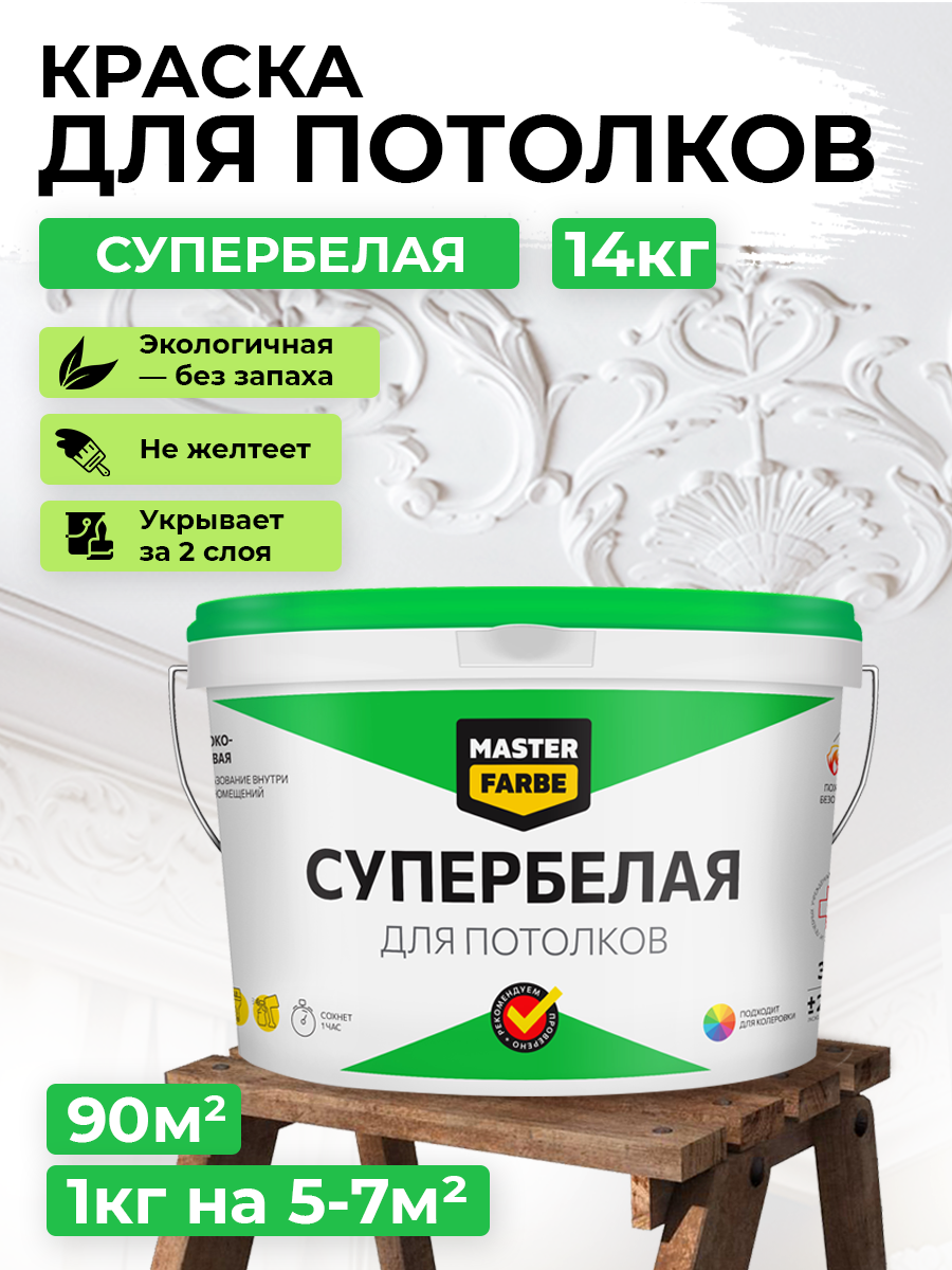 Краска MASTER FARBE супер белая акриловая для потолков в сухих помещениях, Быстросохнущая, Водоэмульсионная, Полуматовое, 14 кг, белый