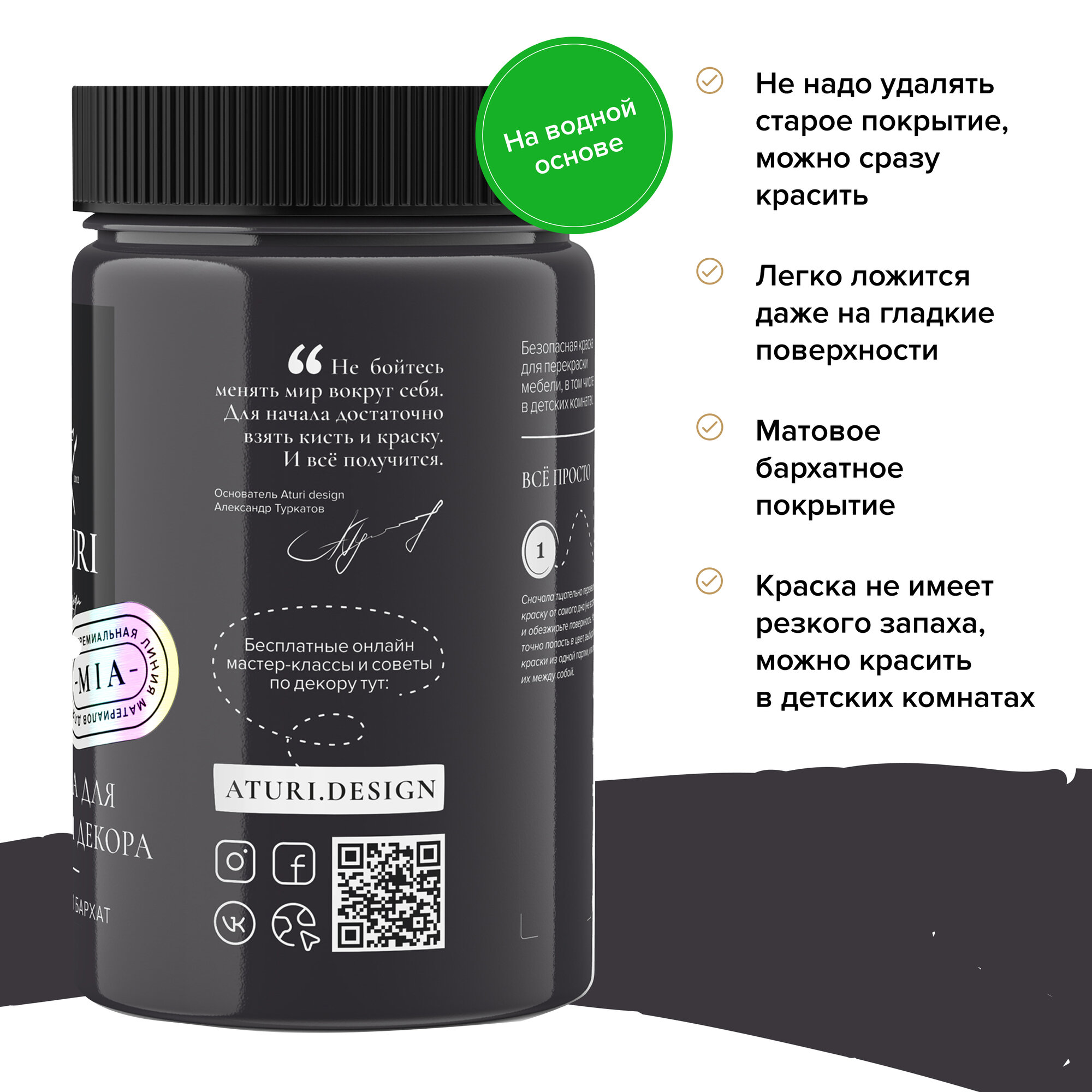 Краска для мебели и декора Aturi Design Mia меловая. Цвет: Черный бархат. Матовая, 0,4 кг, Черный Без запаха.