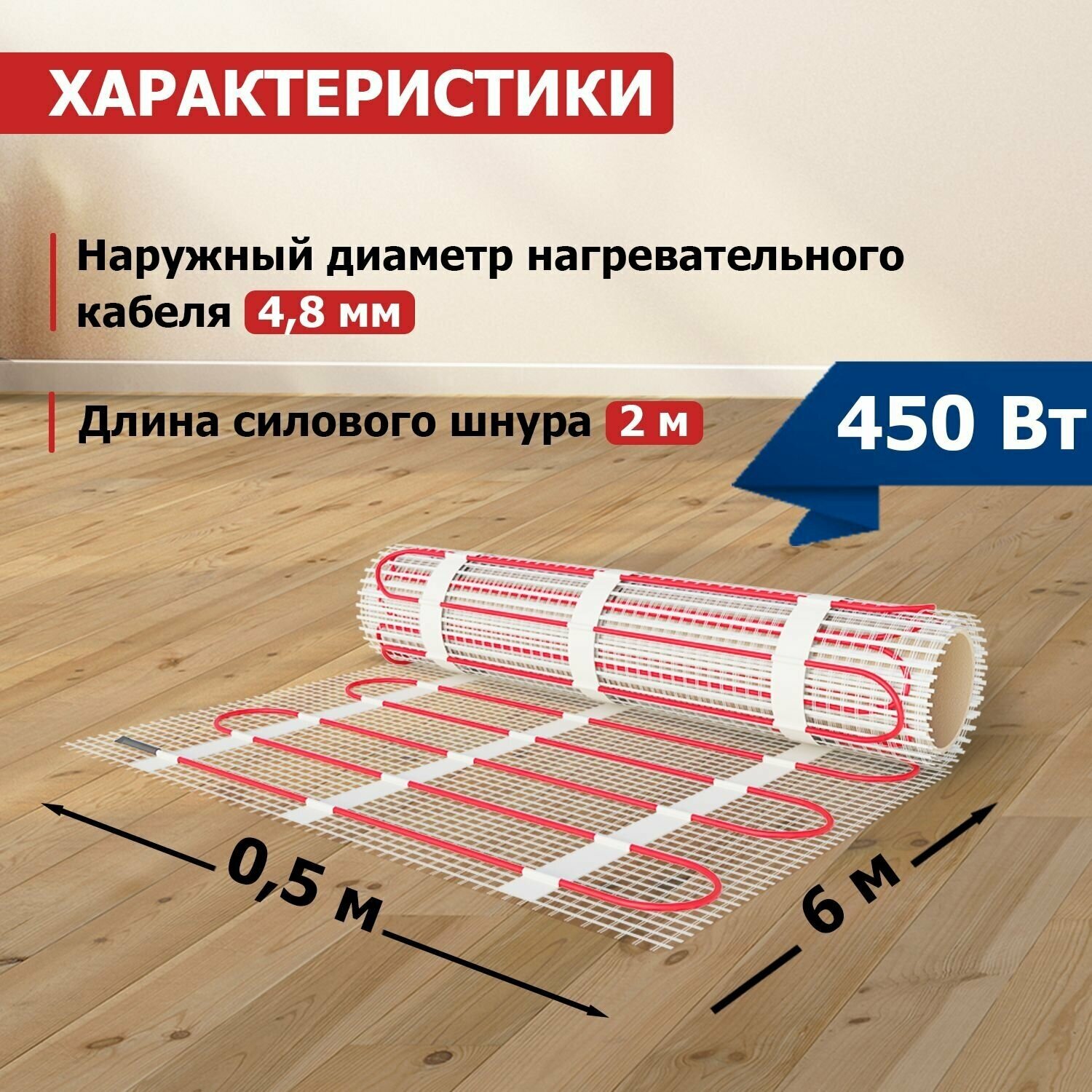 Комплект «Теплый пол» (мат) двухжил. 450Вт 0.5х6м 3кв.м Classic RNX-3-450 с экраном Rexant 51-0506-2