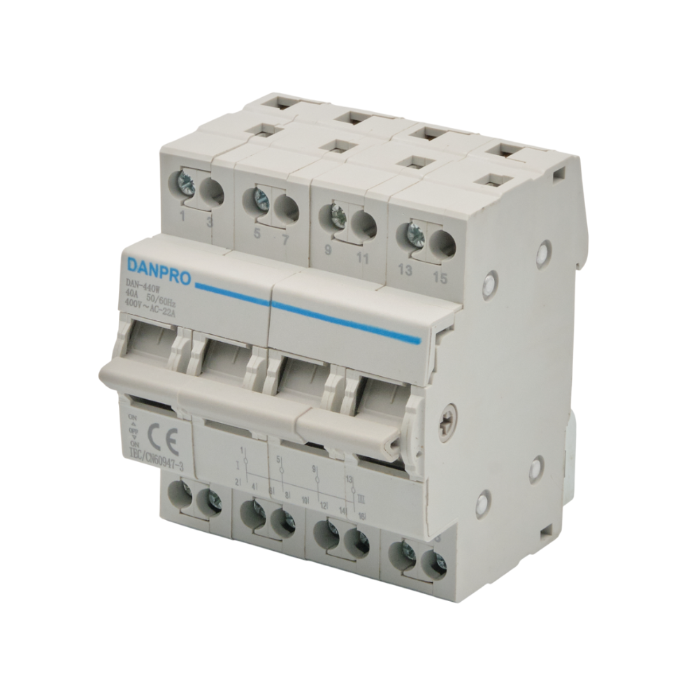 Трехпозиционный переключатель DANPRO на DIN рейку 40А, 4 полюса. Модульный, перекидной, реверсивный рубильник