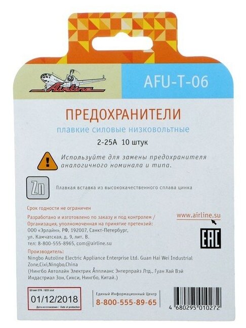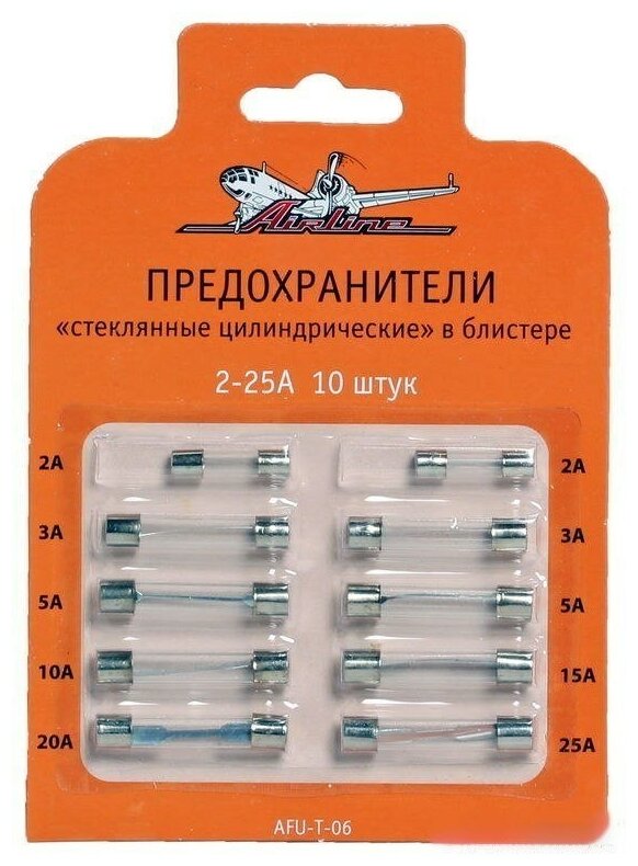 Предохранители стеклянные цилиндрические в блистере (10шт 2-25А) AFU-T-06 airline 1шт